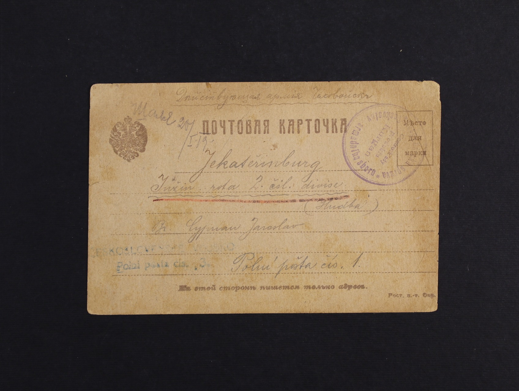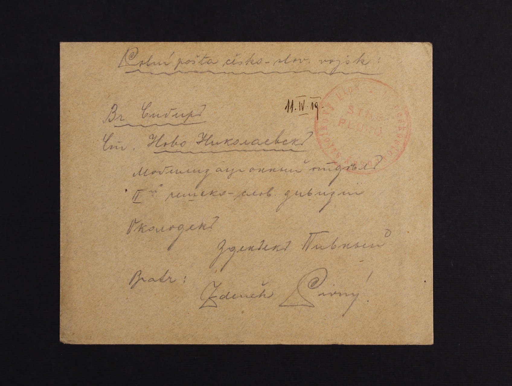 Sibiř - celistvost mezi příslušníky čs. jednotek do Novo Nikolajevska s červeným pod. raz. 1. ČESKOSLOVENSKÝ STŘELECKÝ PLUK ŠTÁB PLUKU s ruční datací 11.4.19