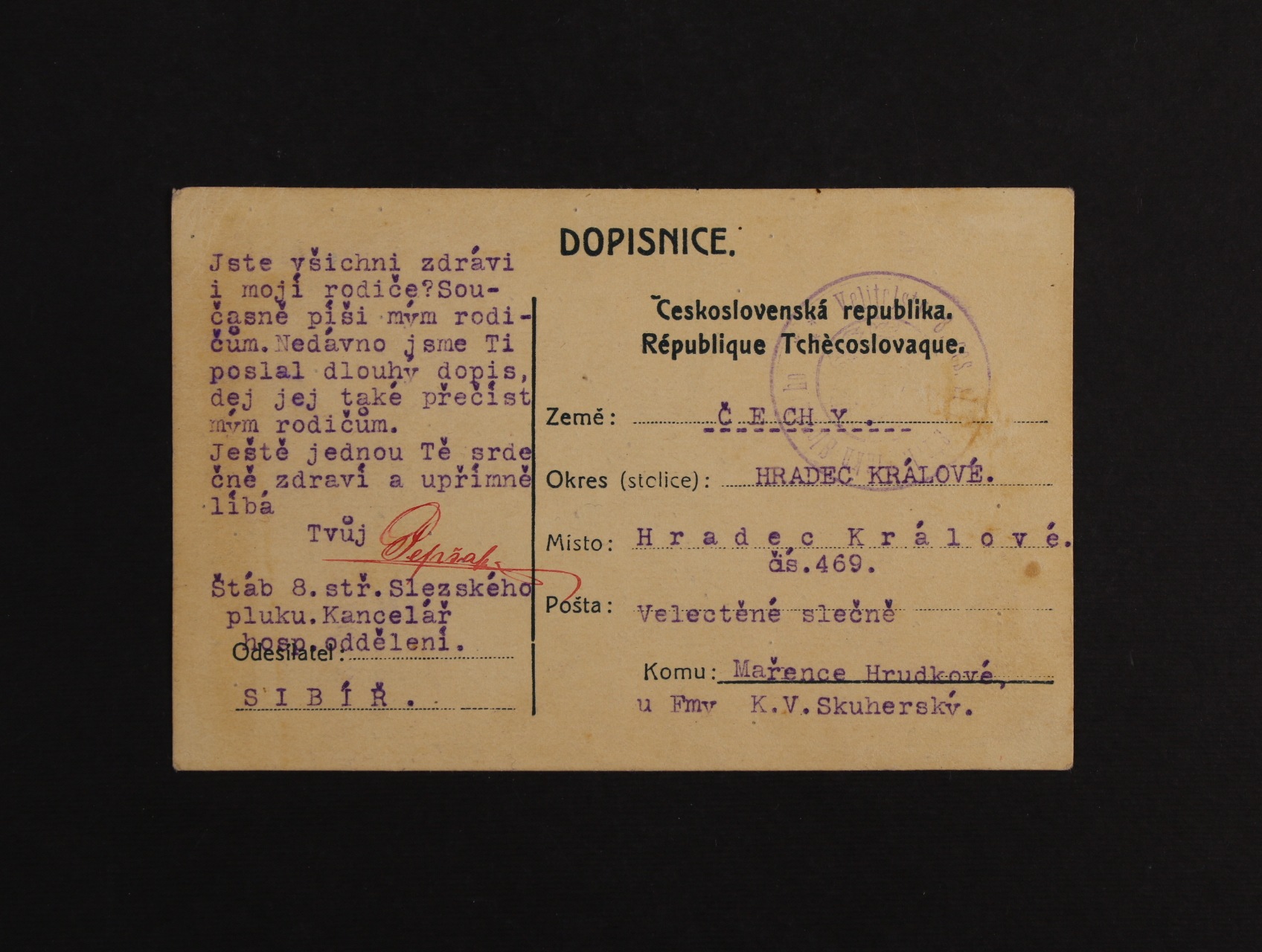 Sibiř - celistvost do Čech od příslušníka 8. střeleckého pluku, podací fialové raz. VELITELSVÍ 8. STŘELECKÉHO SLEZSKÉHO PLUKU