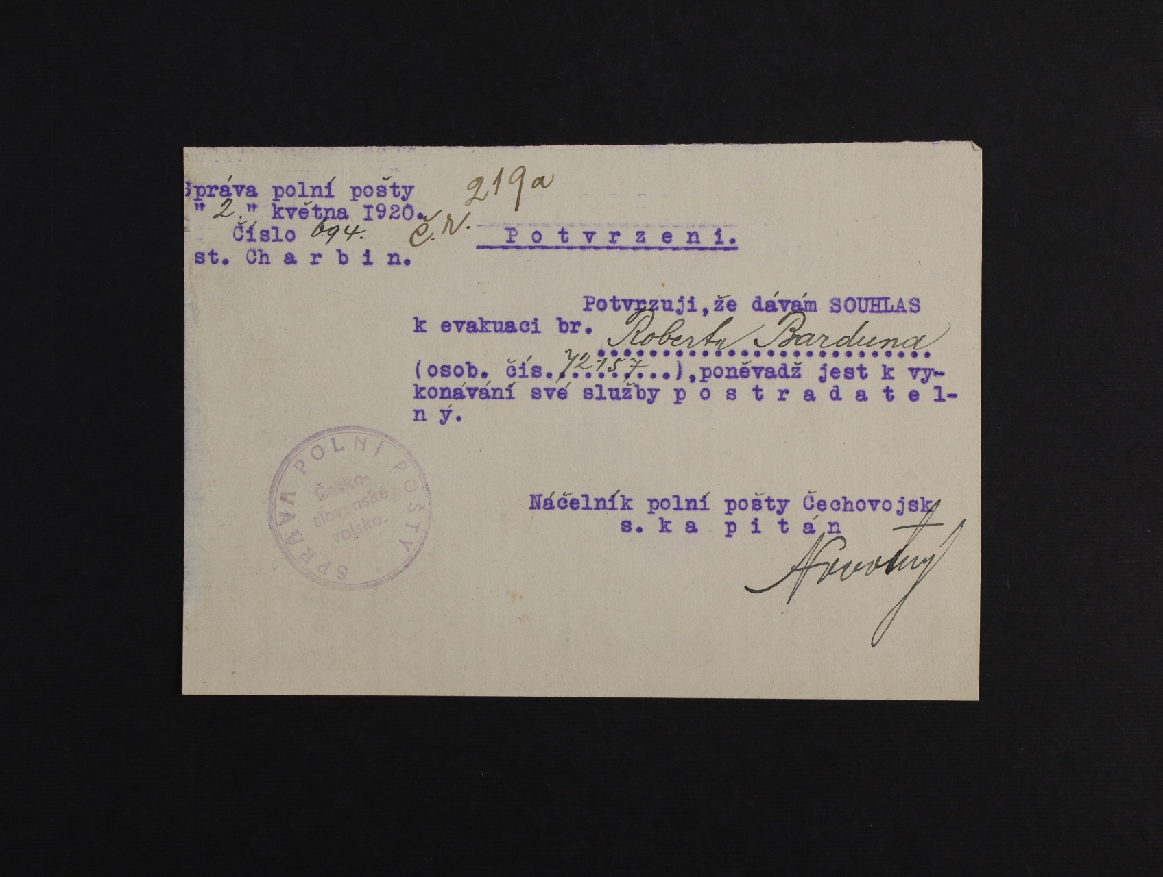 Sibiř - potvrzení Správy polní pošty č. 694 v Charbinu z 2.května 1920 o souhlasu k evakuaci ... s jednokruh. fialovým raz. SPRÁVA POLNÍ POŠTY Československé vojsko