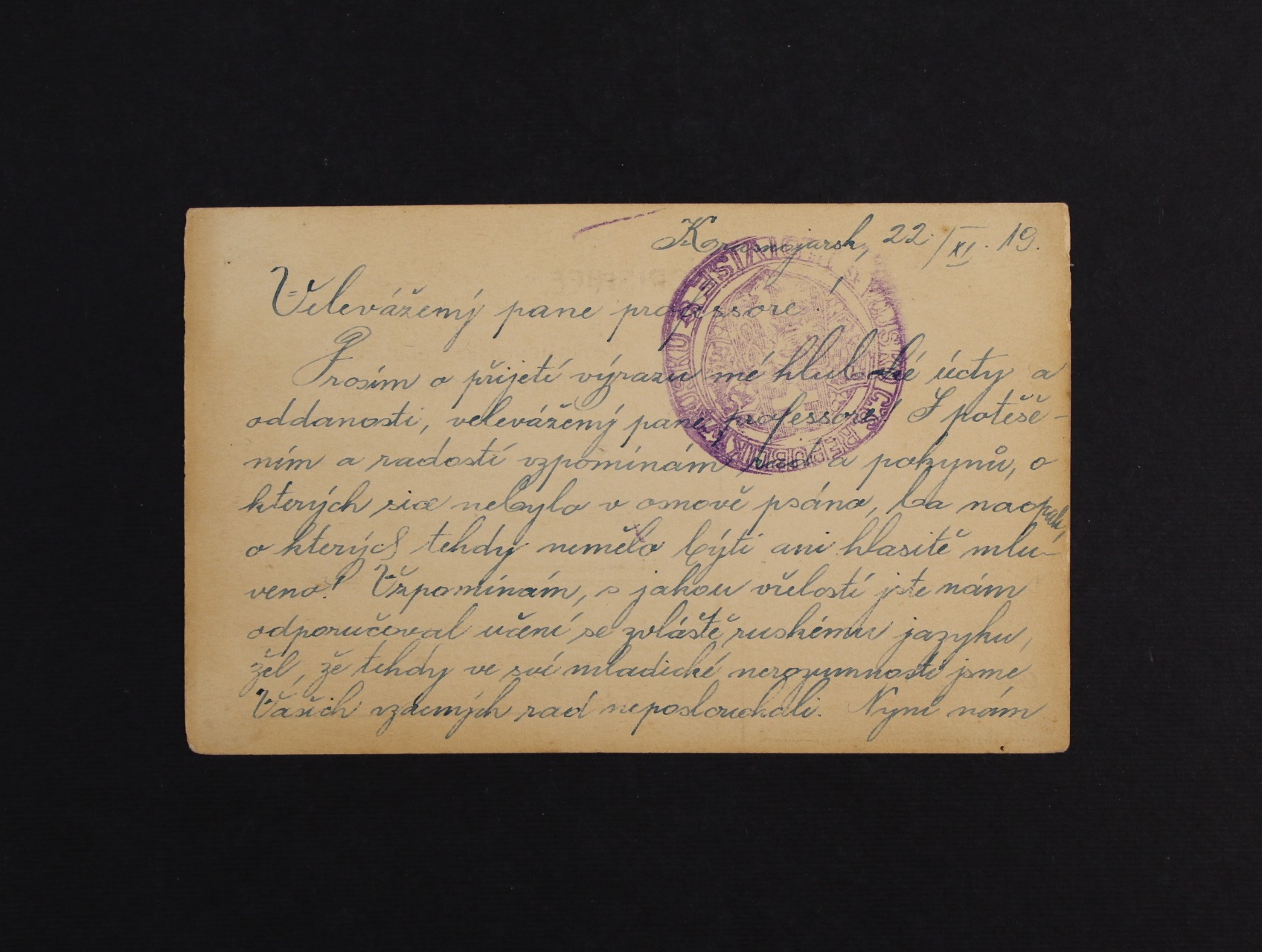 Sibiř - KL do Čech od příslušníka čs. jednotek v Krasnojarsku s dvoukruh. fialovým raz. JEDENÁCTÁ DIVIZE VOJSK ČESKOSLOVENSKÝCH V RUSKU, s datací v textu 22.11.19