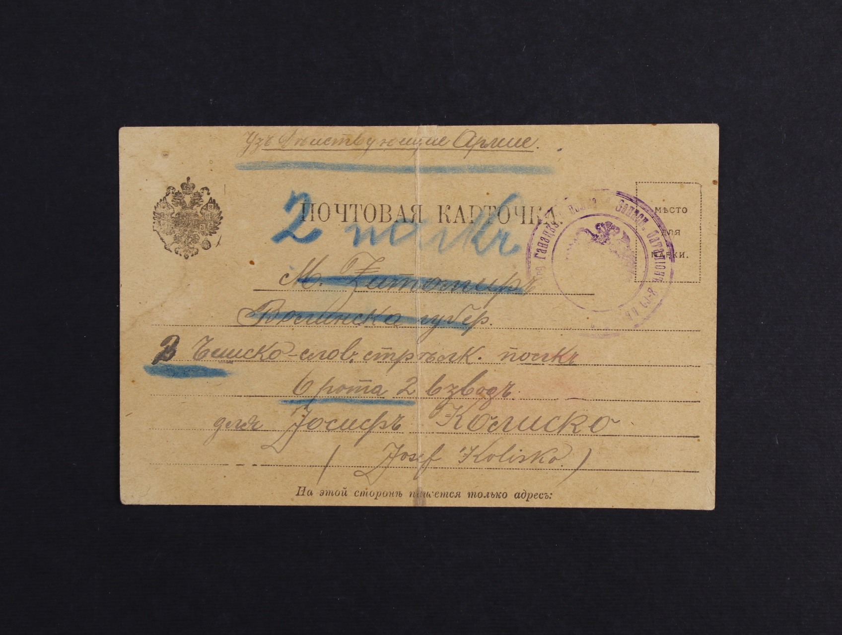 Sibiř - celistvost odeslaná 17.11.17 z Pyritina vlak. poštou Kyjev - Charkov na příslušníka 2. praporu čs. pluku Jiřího z Poděbrad, pod. fialové raz. v azbuce