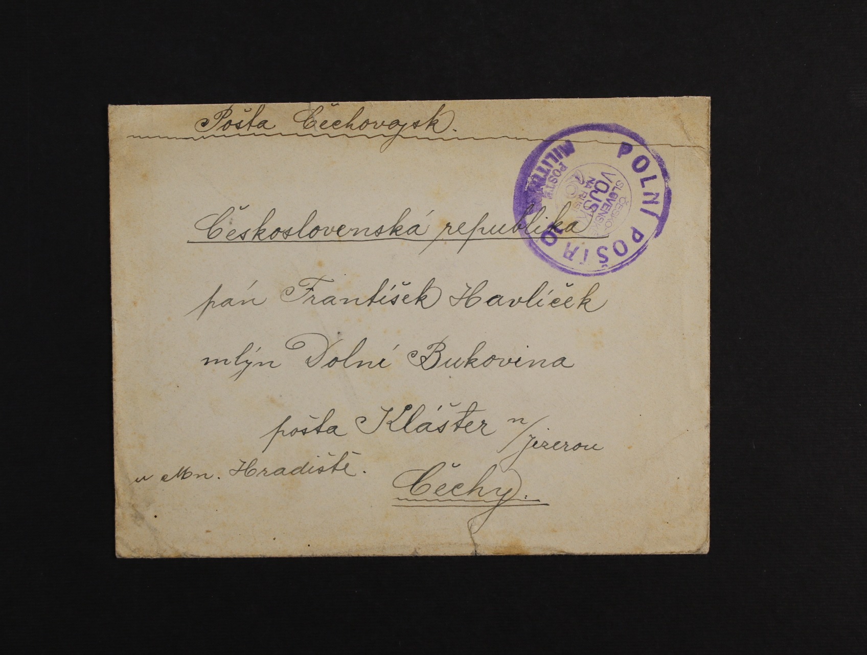 Sibiř - celistvost do Čech vč. obsahu odeslaný příslušníkem 10. střel. pluku Jana Sladkého Koziny s pod. fialovým dvoukruh. raz. POLNÍ POŠTA 10 ČESKOSLOVENSKÉ VOJSKO NA RUSI