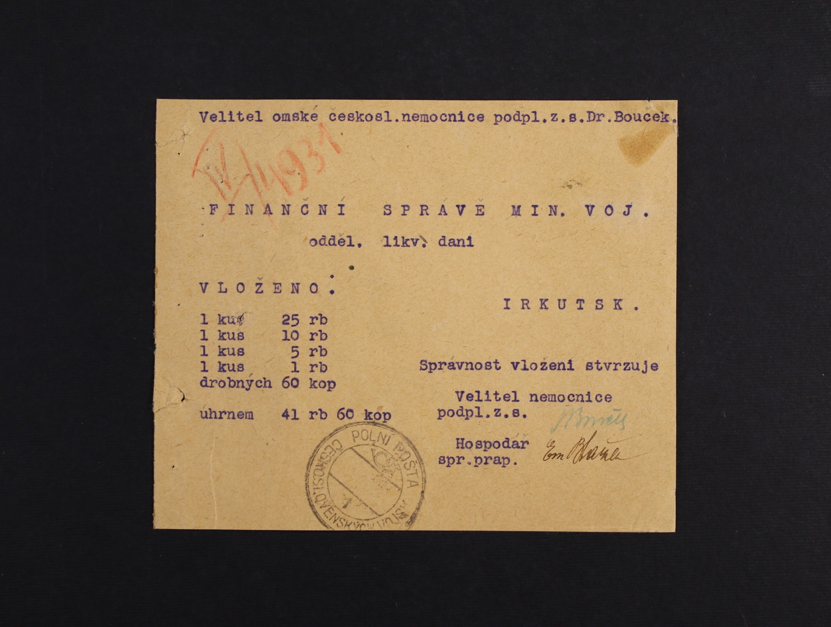 Sibiř - dopis na Finanční správu min. voj., oddělení likvidace daní v Irkutsku od velitele Omské čs. nemocnice s černým dvoukruh. raz. POLNÍ POŠTA ČESKOSLOVENSKÝCH VOJSK 1, na zadní str. neporušené pečetě, dopis na třech stranách otevřen