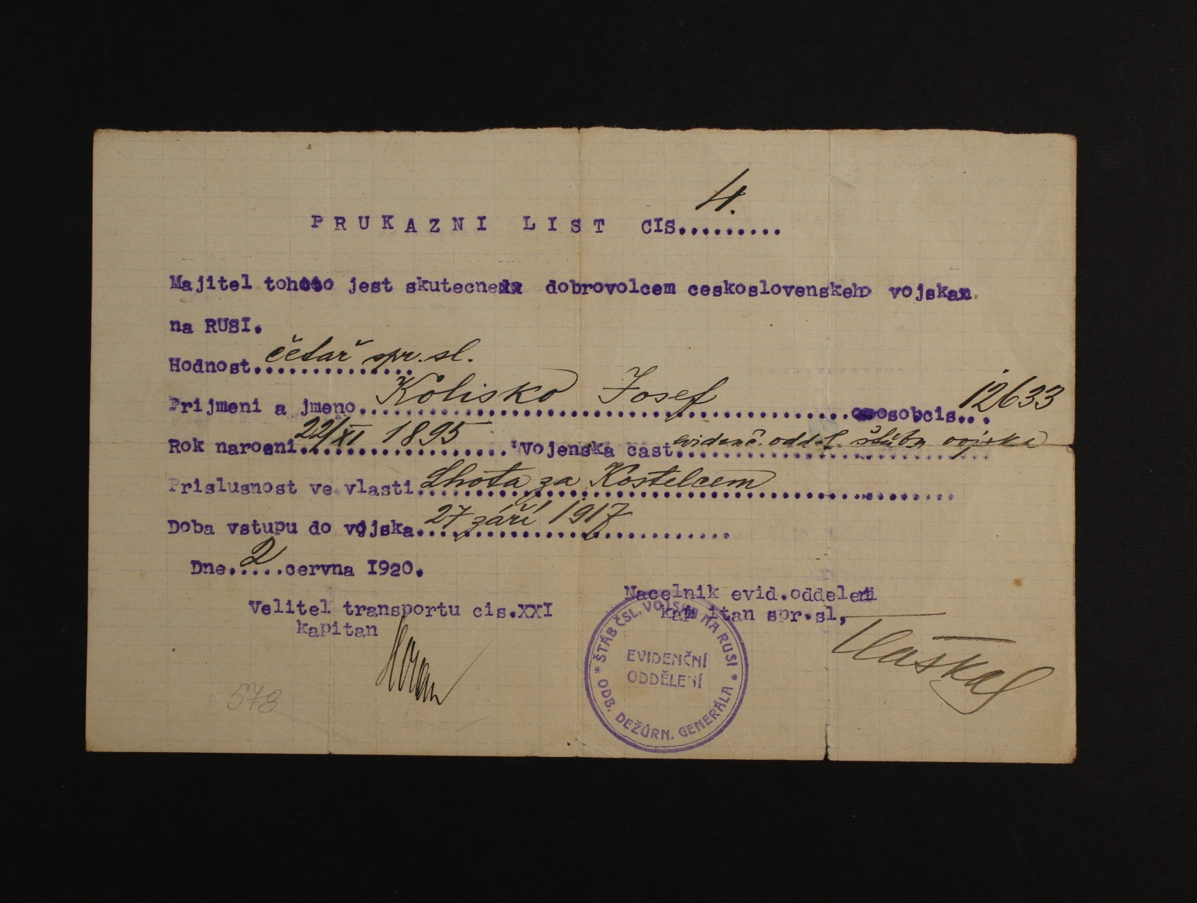 Sibiř - PRŮKAZNÍ LIST Č. 4, který potvrzuje skutečnost, že dobrovolcem československého vojska na RUSI v hodnosti četaře ... s datací 27.září 1917 a jednokruh. fialovým raz. ŠTÁB ČSL. VOJSKA NA RUSI EVIDENČNÍ ODDĚLENÍ ODB. DEŽURN. GENERÁLA a podpisy velitele a náčelníka