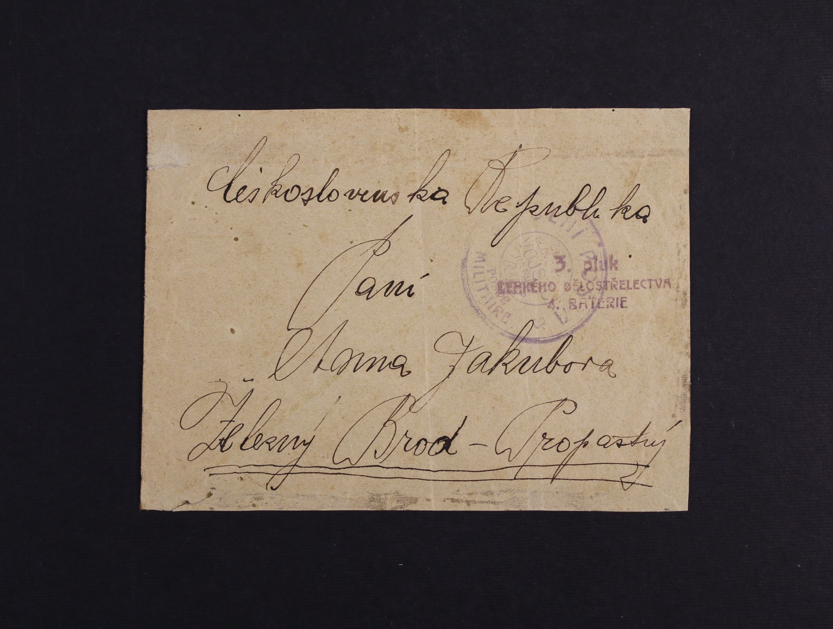 Sibiř - celistvost do Čech s modrým dvoukruh. raz. POLNÍ POŠTA ČESKOSLOVENSKÉ VOJSKO NA RUSI + fialové útvar. řádk. raz. 3. pluk LEHKÉHO DĚLOSTŘELECTVA 4. BATERIE, zajímavé