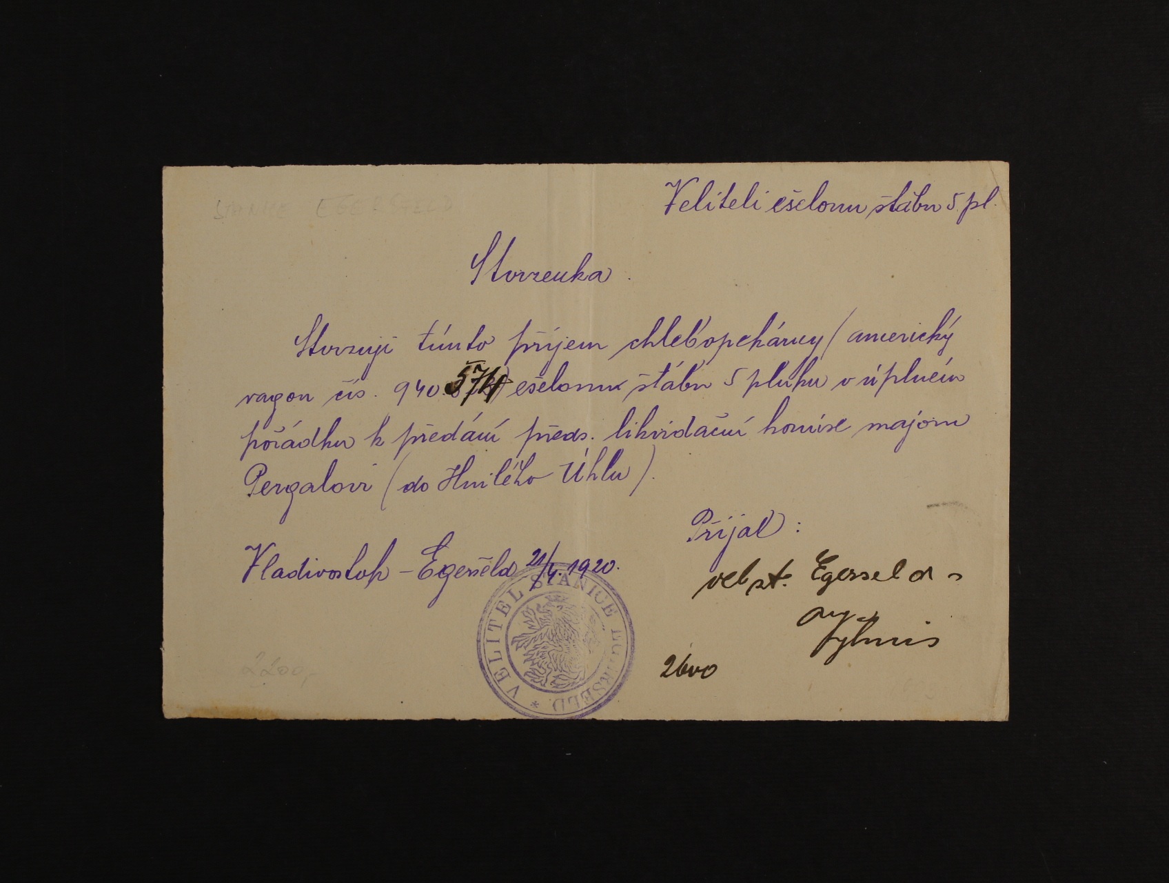Sibiř - stvrzenka Veliteli ešalonu štábu 5. pluku o příjmu chlebopekárny (americký vagon č. 940574) s datací 21.4.20S a dvojkruh. fialovým raz. VELITEL STANICE EGERSFELD s jeho podpisem, zajímavý dobový doklad