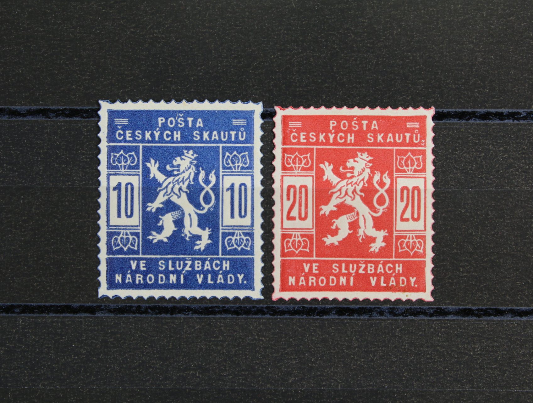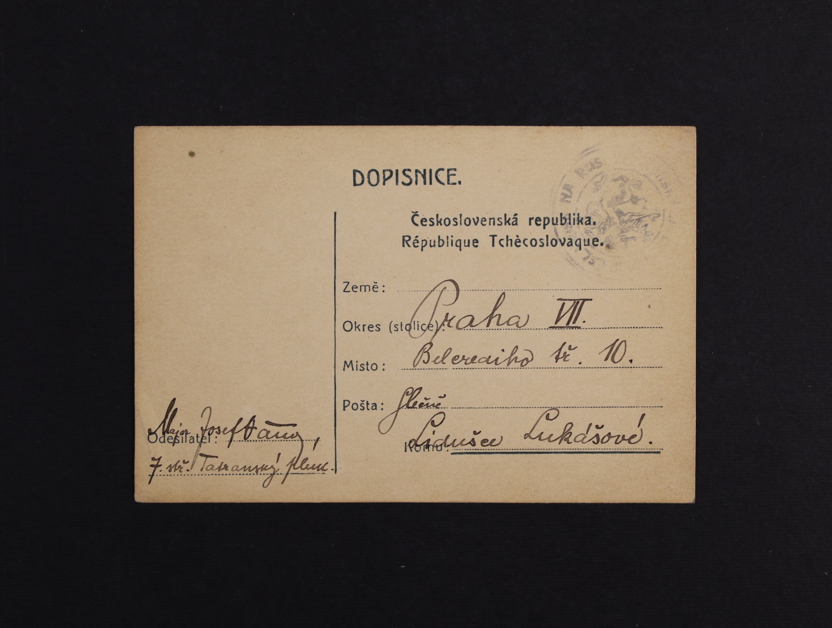 kompl. poštovní balíková průvodka na balík zaslaný na náhradní prapor čs. pěšího pluku č. 28 v Josefově, pod. raz. TÝNEC NAD SÁZAVOU 3.12.19 + fialové raz. ČESKOSLOVENSKÉ ZEMSKÉ ČETNICKÉ VELITELSTVÍ STANICE PRO ČECHY, na zadní str. přích. raz. JOSEFOV 11.12.19, zajímavé