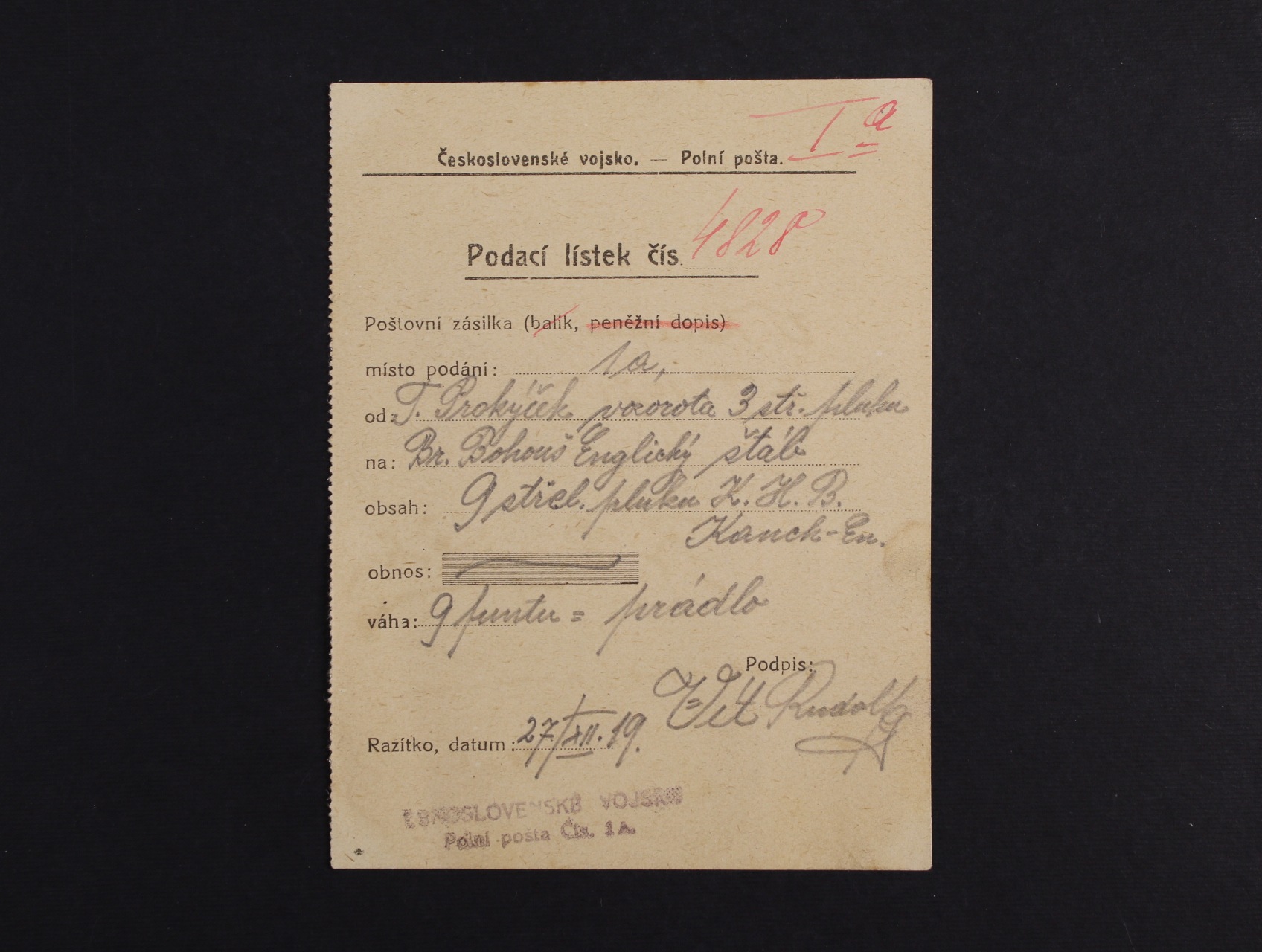 Sibiř - podací lístek na balík s datací 27.12.19 s řádk. fialovým raz. ČESKOSLOVENSKÉ VOJSKO Polní pošta Čís. 1 A, zajímavé