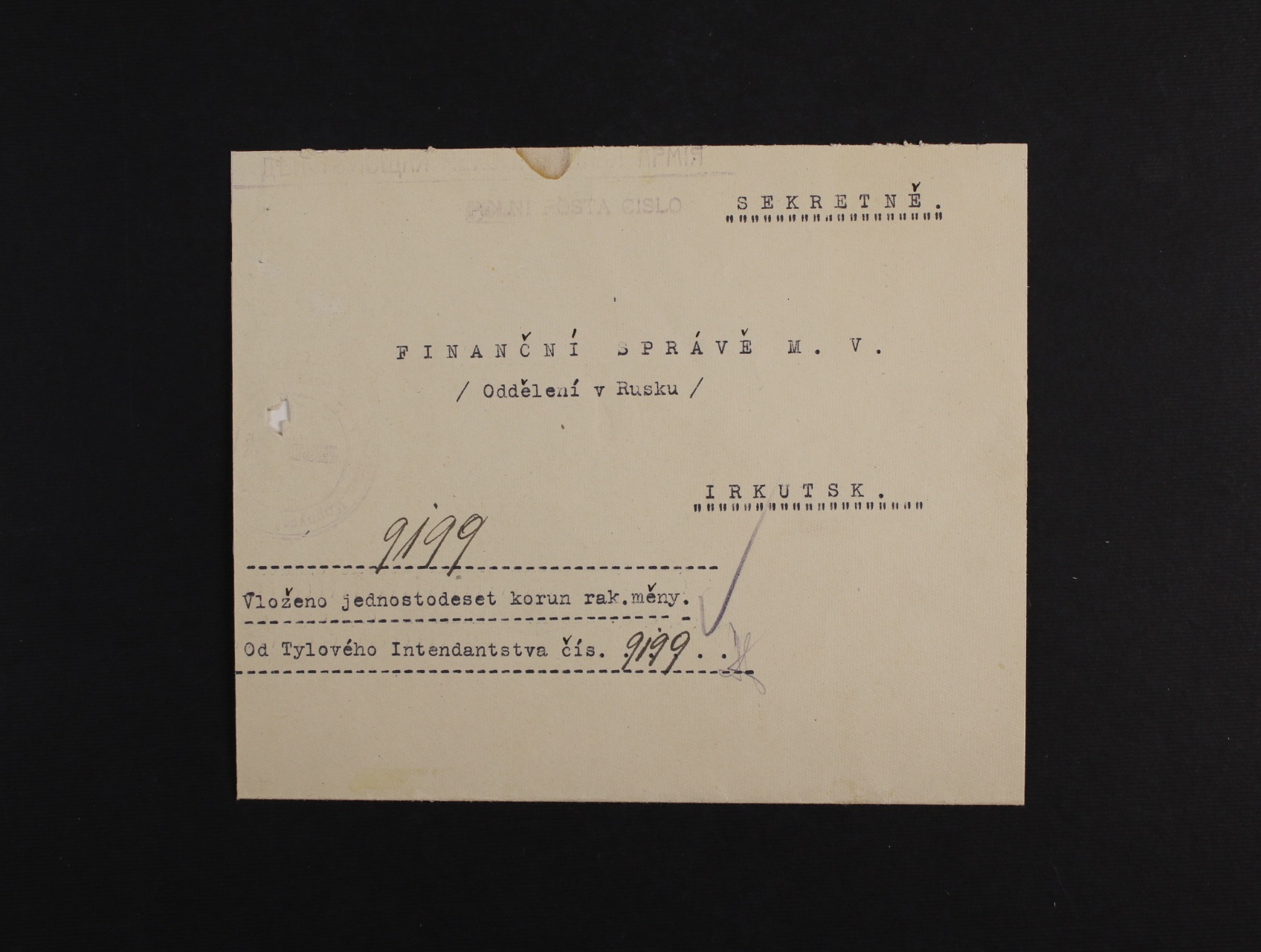 Sibiř - nekompl. dopis Finanční správě M. V. v Irkutsku s oznámením o vložení jedno sto deset korun rakouské měny od Týlového Intendanstva č. 9199, na horní části špatně čitelné dvojjazyčné fialové raz. BOJOVNÍK ČESKOSLOVENSKÉ ARMÁDY a řádk. raz. POLNÍ POŠTA ČÍSLO