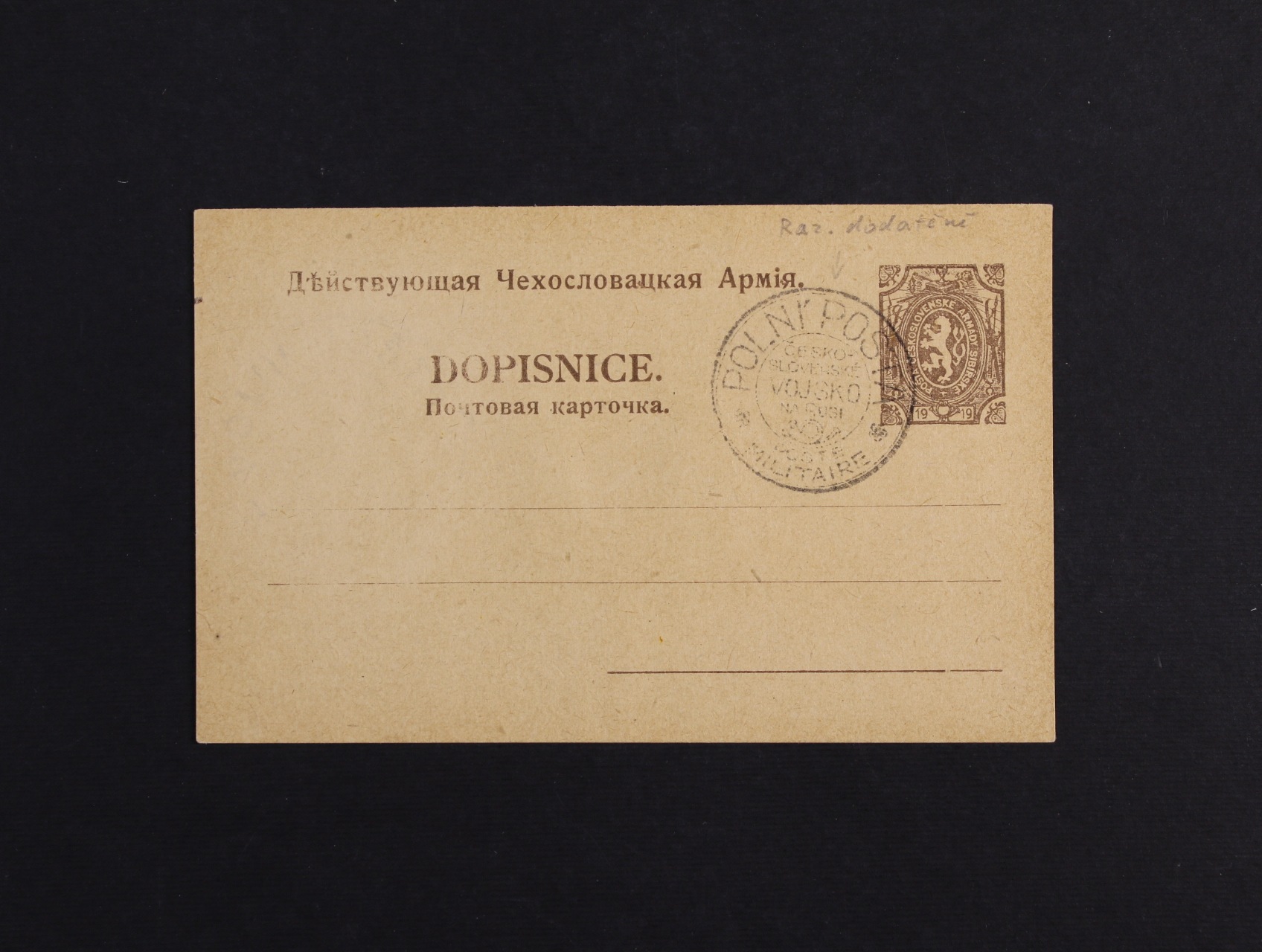 Sibiř - vojenská dopisnice čs. armády na Sibiři CRV 23 s raz. z ochoty POLNÍ POŠTA ČESKOSLOVENSKÉ VOJSKO NA RUSI, nepoužitá, kat. cena 9000 Kč