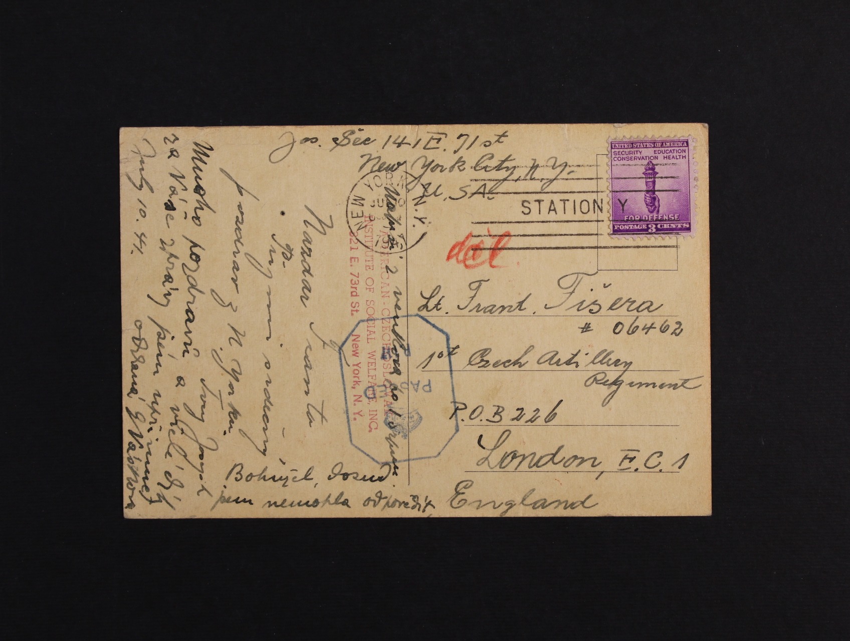 Anglie - pohlednice VYTRVÁME! ZVÍTĚZÍME! vydaná v New Yorku a zaslaná na důstojníka 1. Čs. jednotky v Anglii, pod. raz. NEW YORK 10.JUL 41 + rámečkové modré cenzurní raz., zajímavé