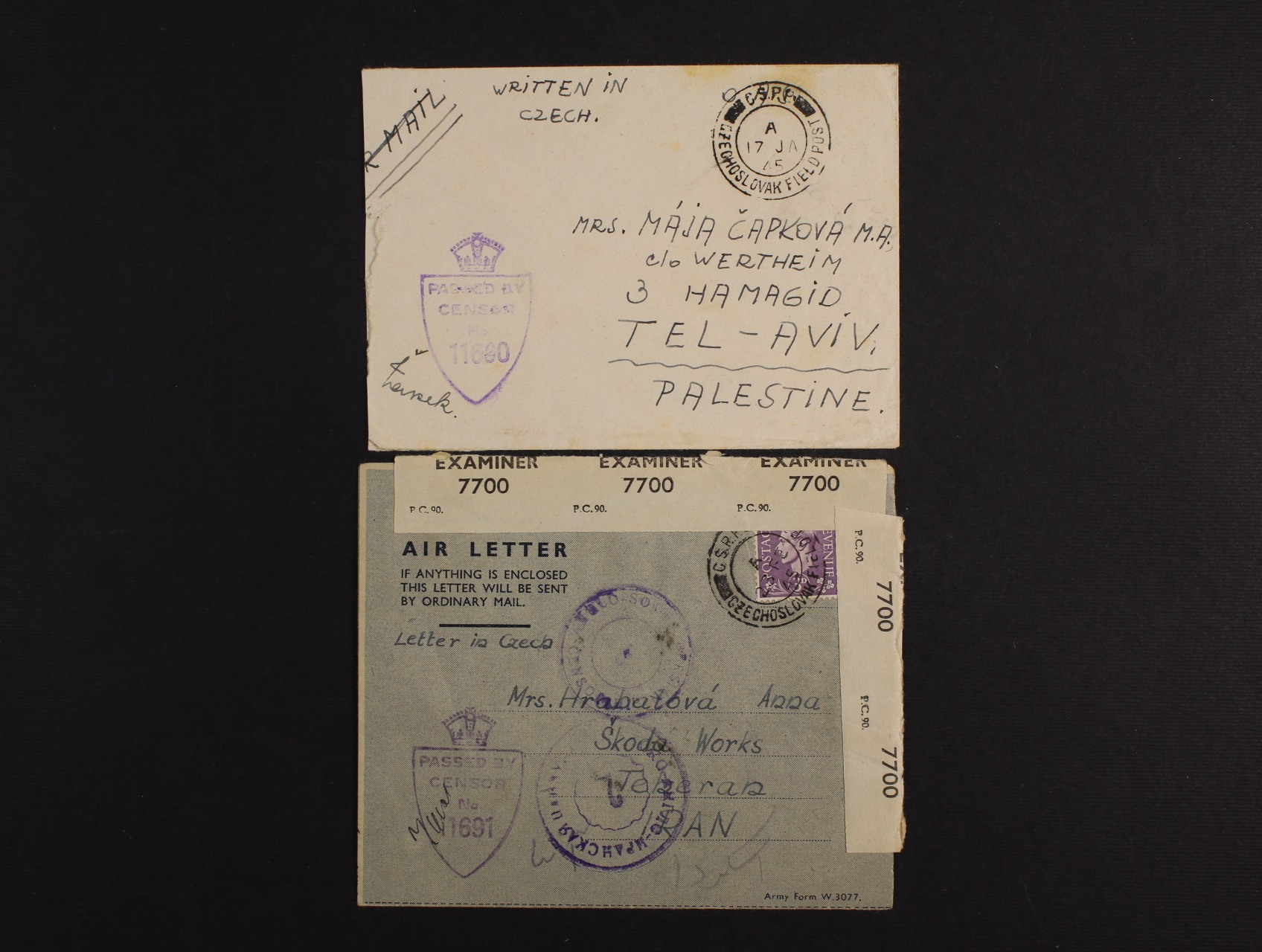 Anglie - Dálný východ - dopis ze 17.1.45 od čs. vojáka z Anglie do Tel Avivu s cenzurním raz. 11680 a frankovaný dopis z 23.2.45 na motorovou divizi tankové brigády na Škodu Works s leteckou cenzurou 11691