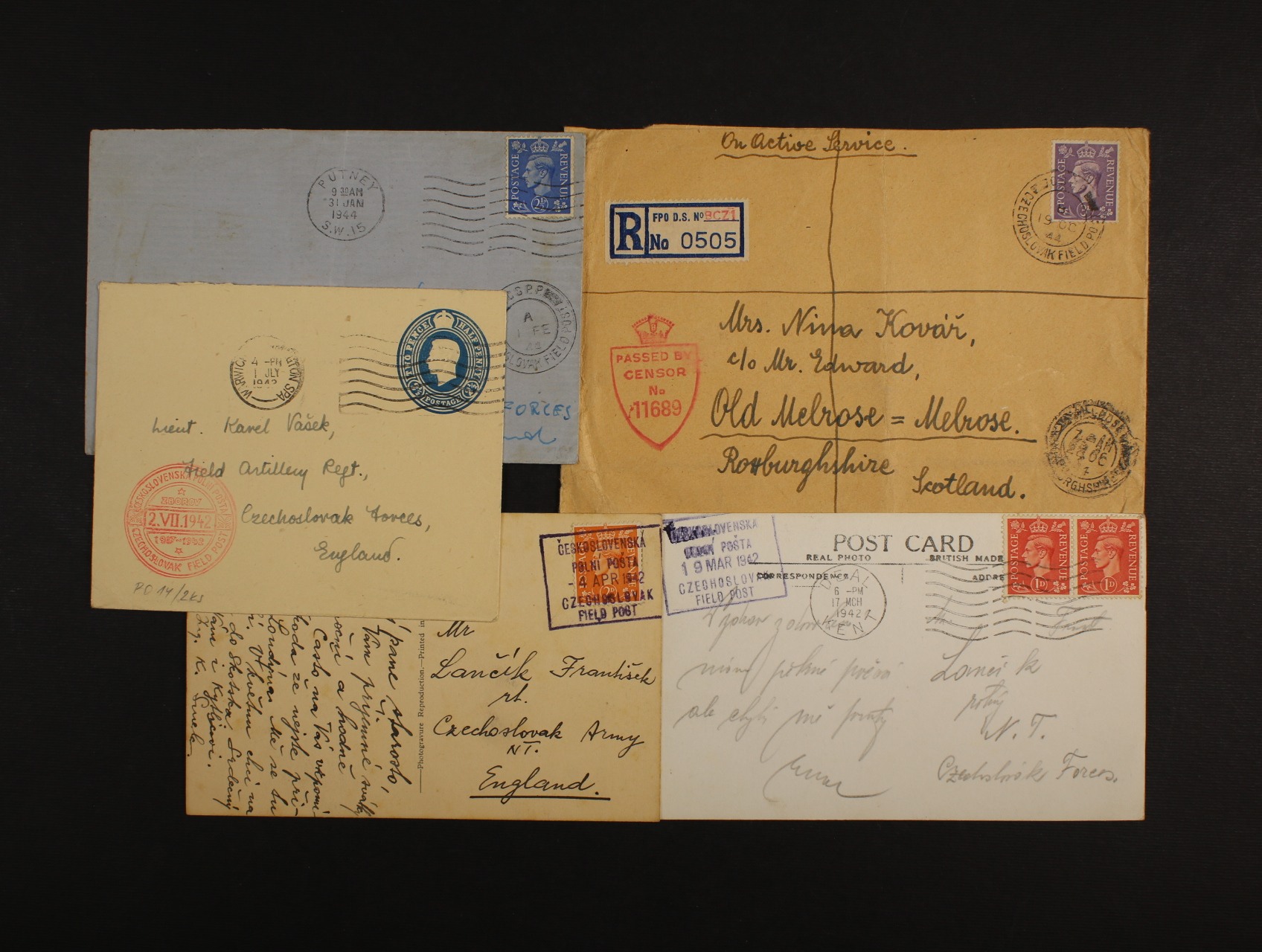 Anglie - sestava 5 ks celistvostí, 1x RECO, z let 1942 - 4 mezi příslušníky čs. jednotek v Anglii, zajímavá přídavná útvar. raz.