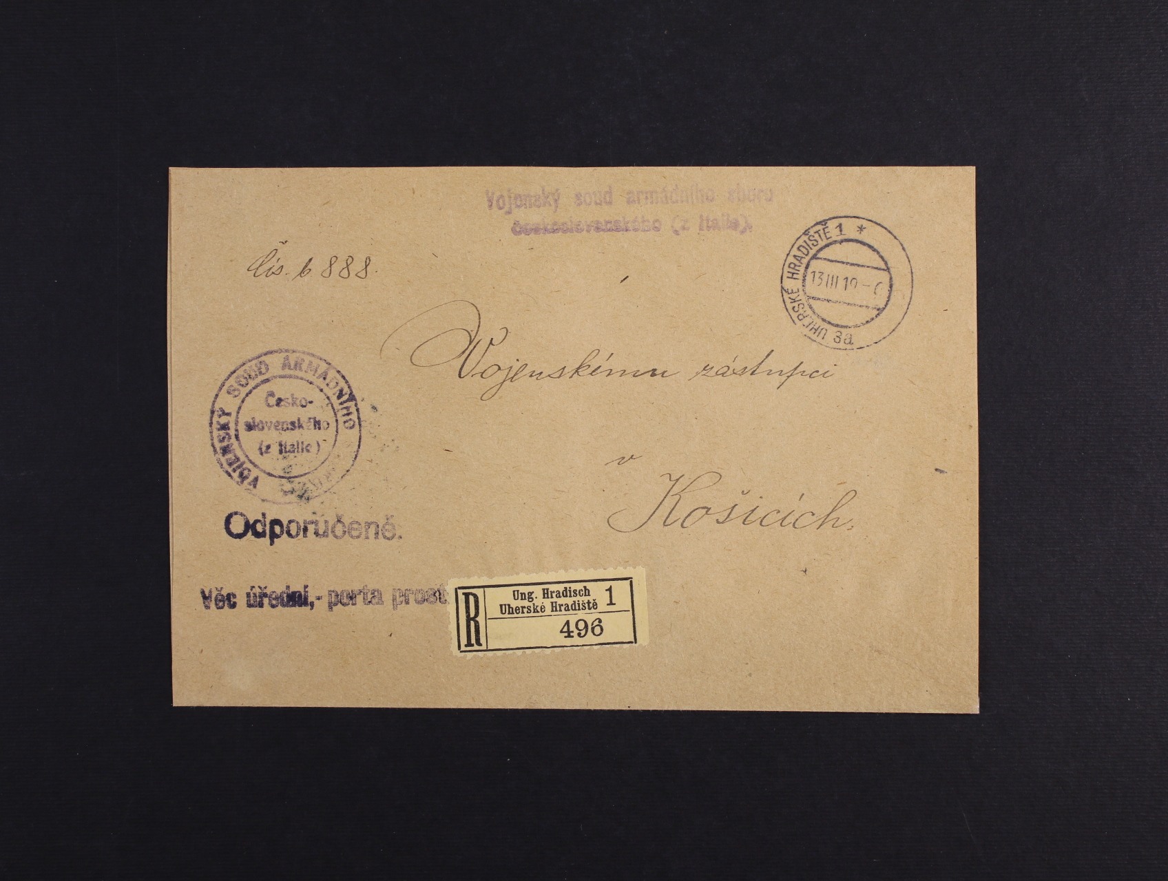 Slovensko - R-dopis zaslaný z Vojenského soudu armádního sboru československého (z Itálie) do Košic, pod. raz. UHERSKÉ HRADIŠTĚ 1 13.3.19, na zadní str. přích. raz. ČESKOSLOVENSKÁ POLNÍ POŠTA 75 16.3.19