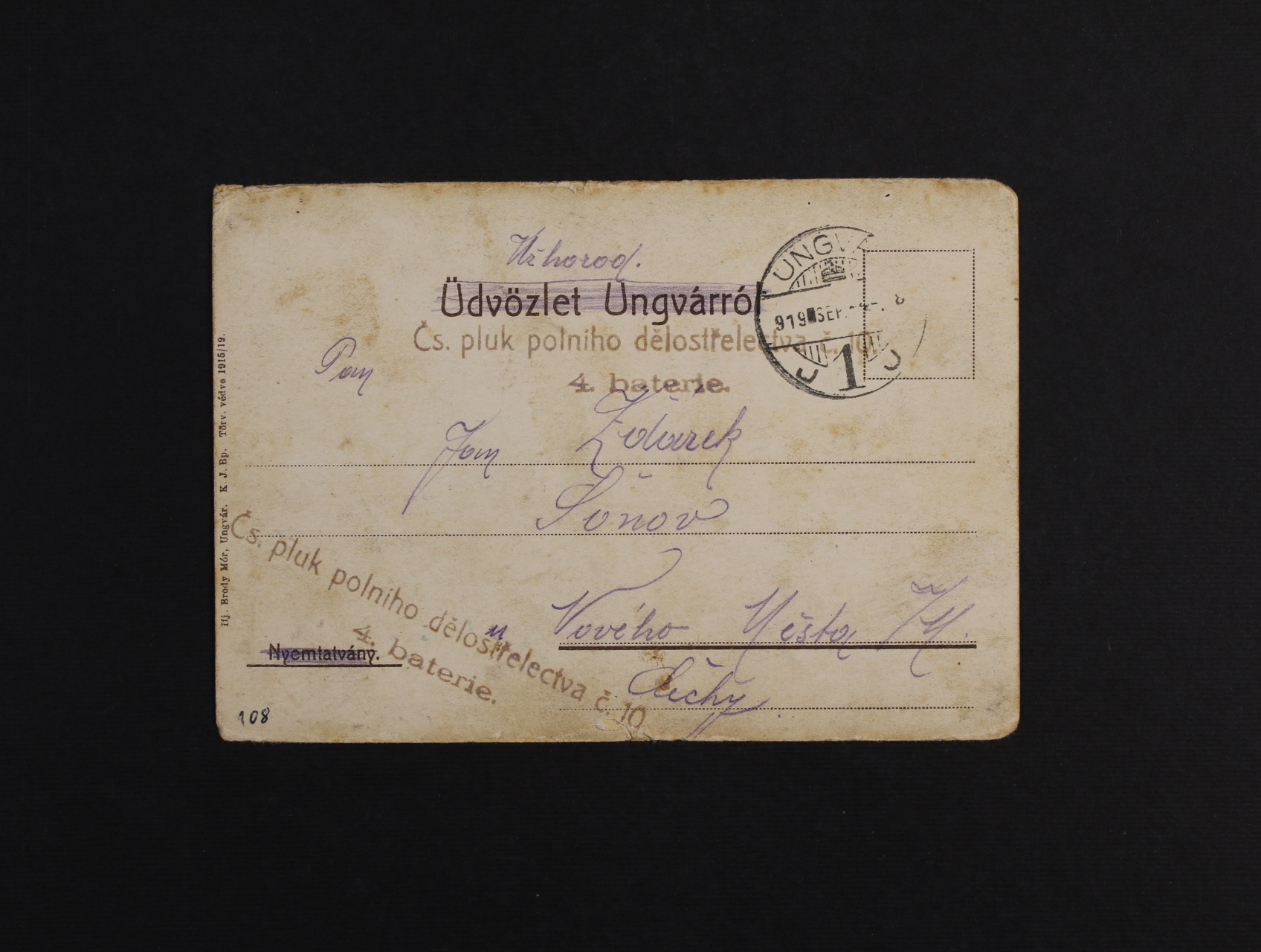 Slovensko - jednobar. okénková pohlednice Užhorodu, pod. raz. UNGVÁR SEPT. ..19 + útvar. řádk. raz. Čs. pluk dělostřelectva č. 10 4. baterie