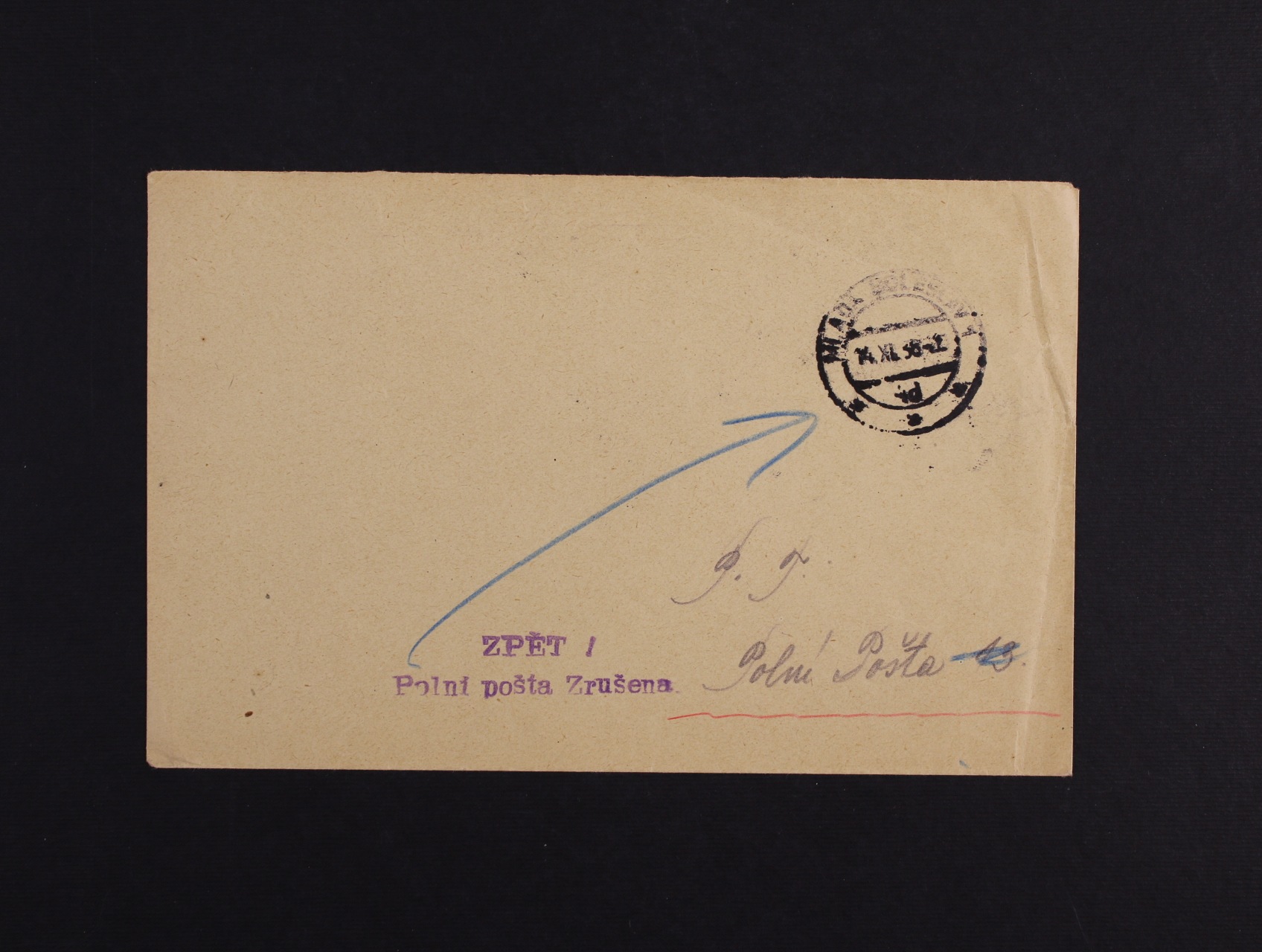 Slovensko - dopis na PP č. 13, pod. raz. MLADÁ BOLESLAV 10.11.38, s řádk. fialovým raz. ZPĚT/Polní pošta Zrušena