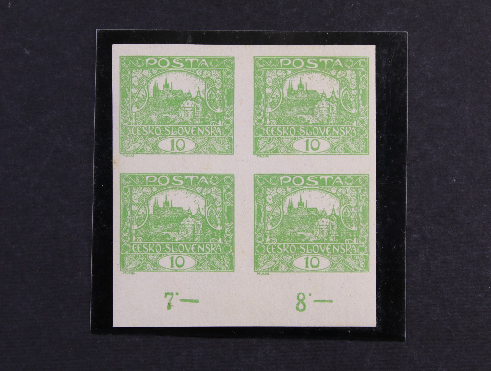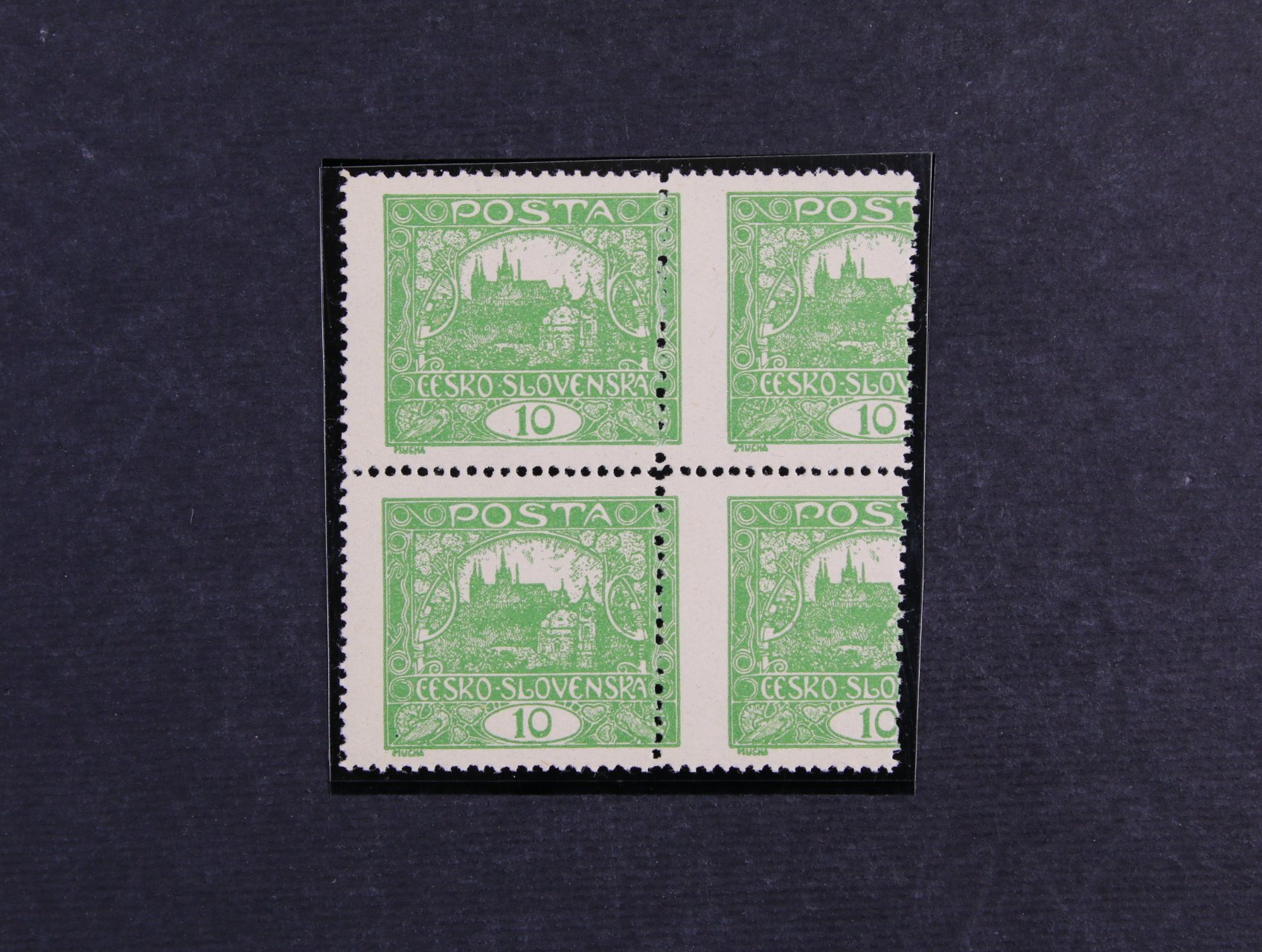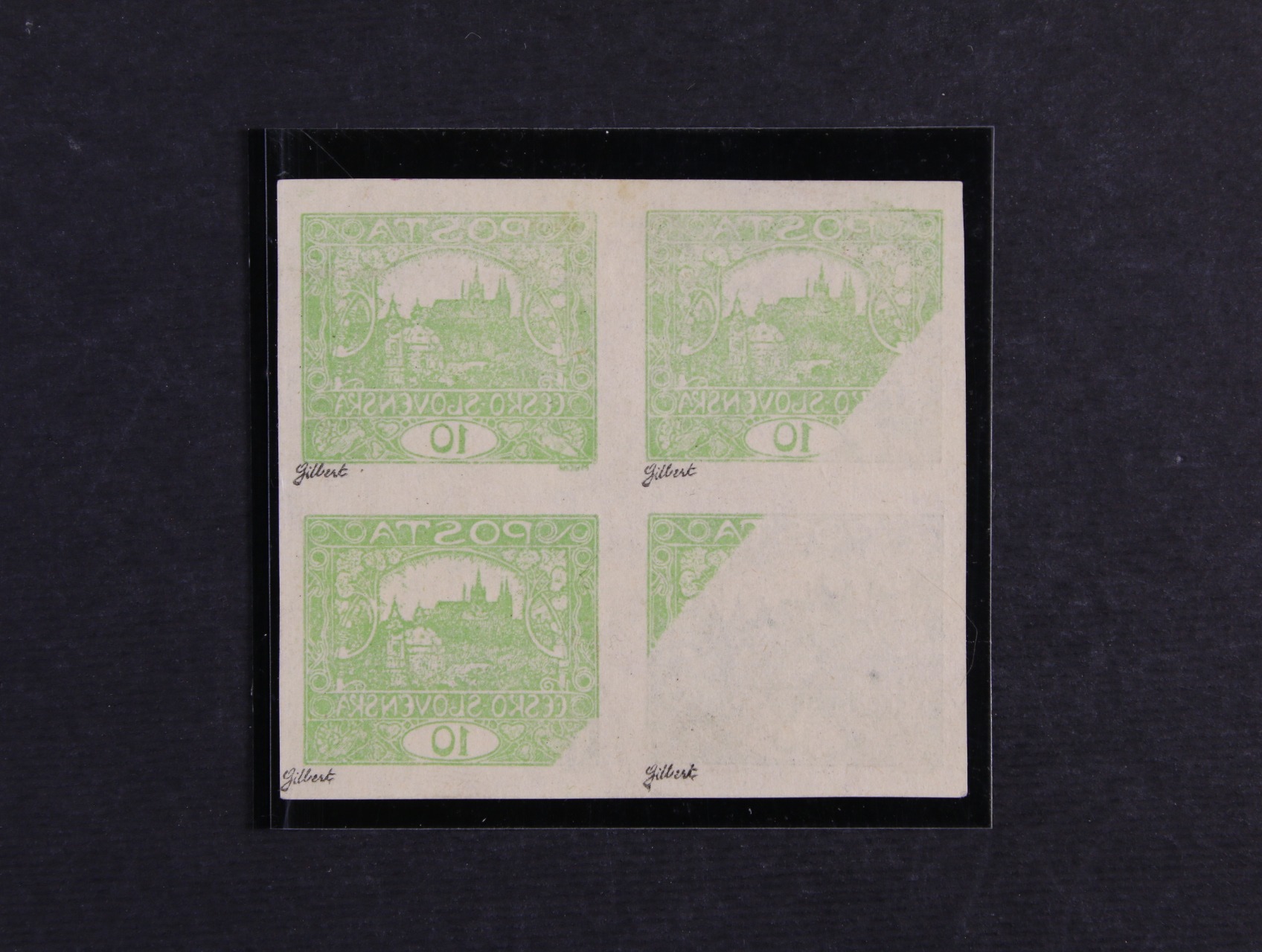 69 zn. č. 6 ve čtyřbloku s téměř kompl. stroj. obtiskem, v horní části nepatrné lomy v papíru a neznatelná stopa po nál., zk. Gilbert 2600