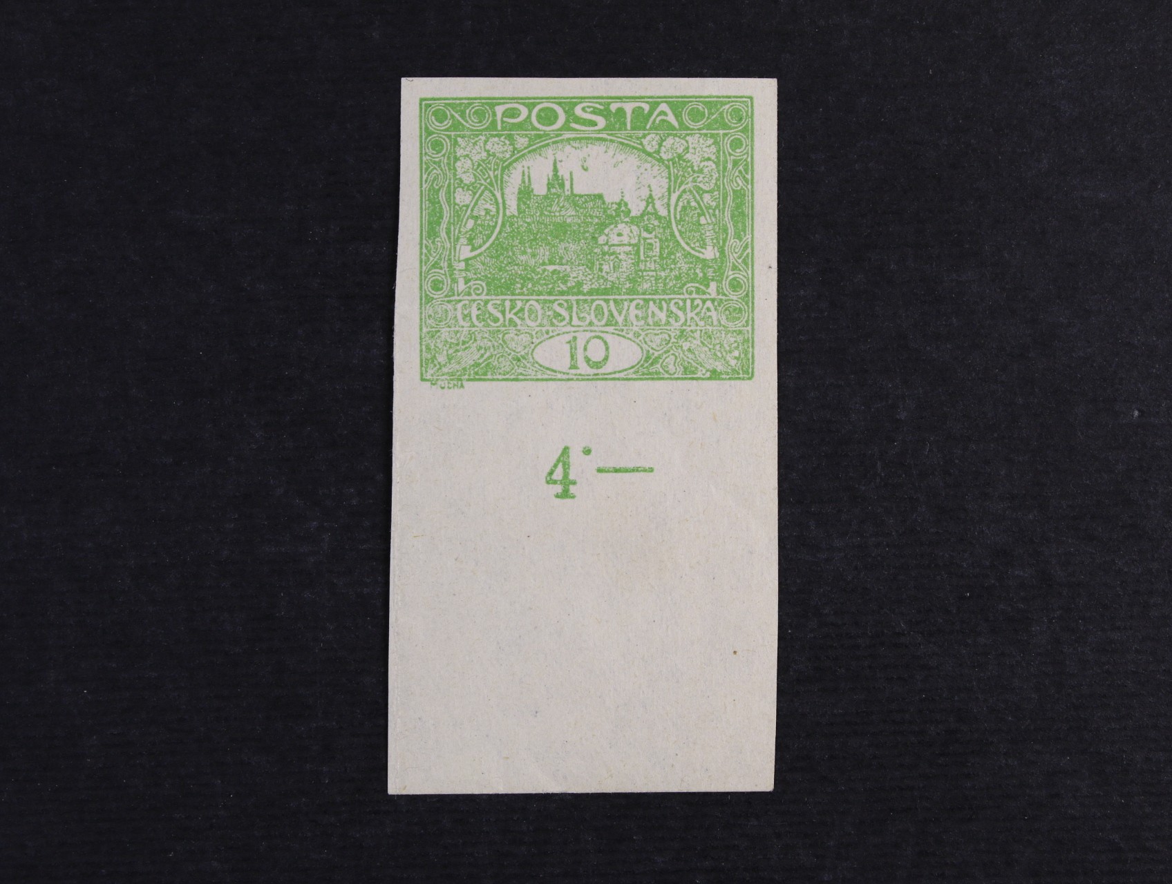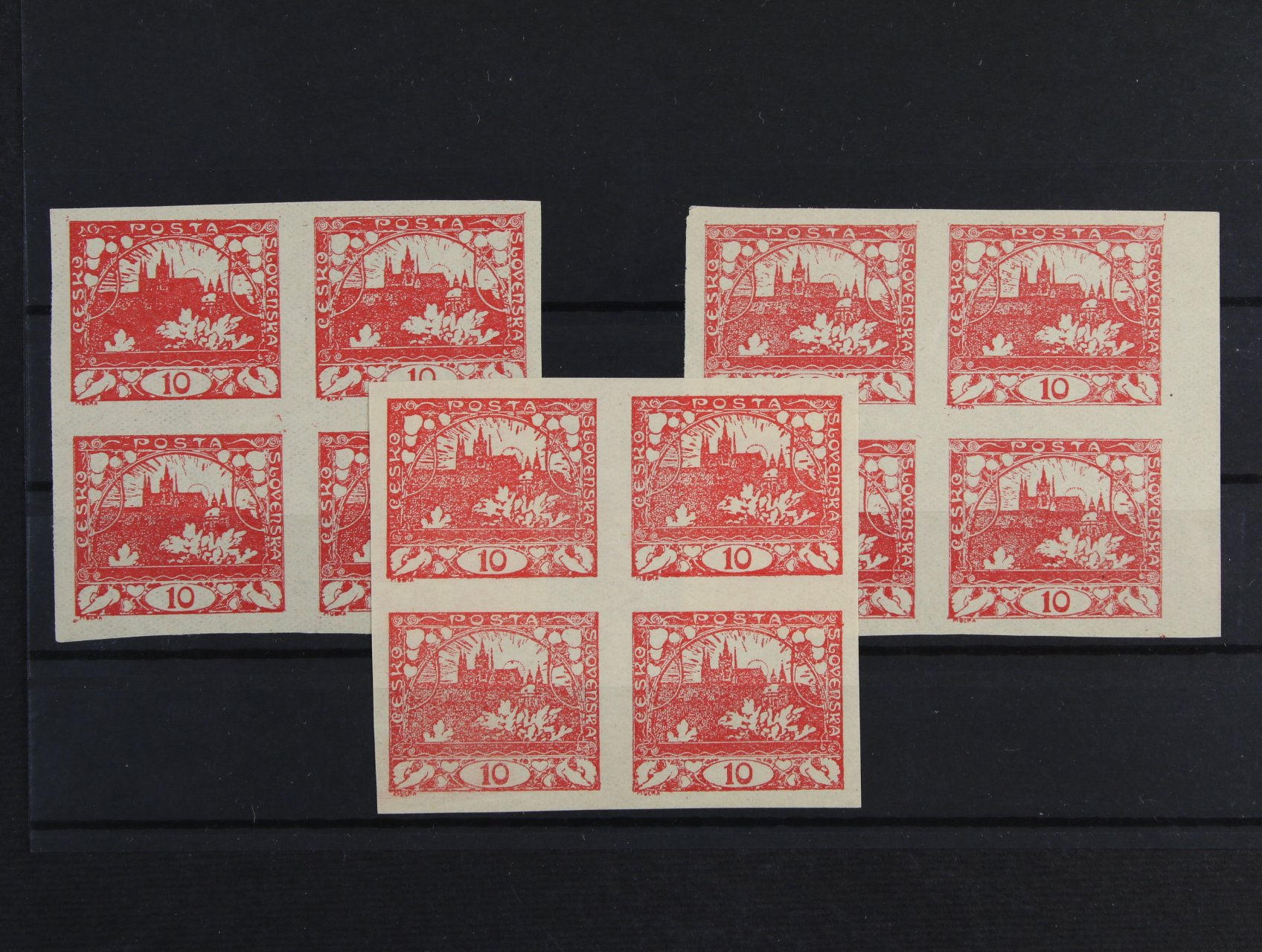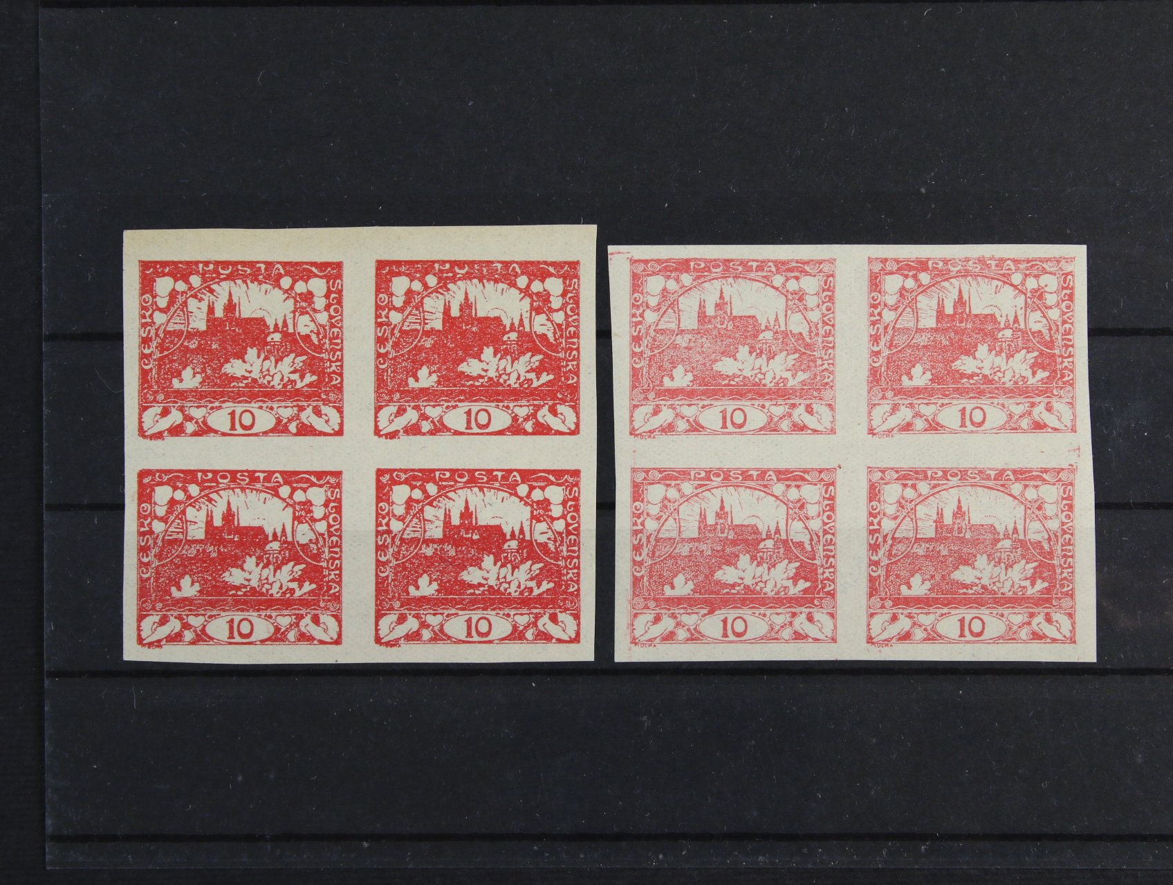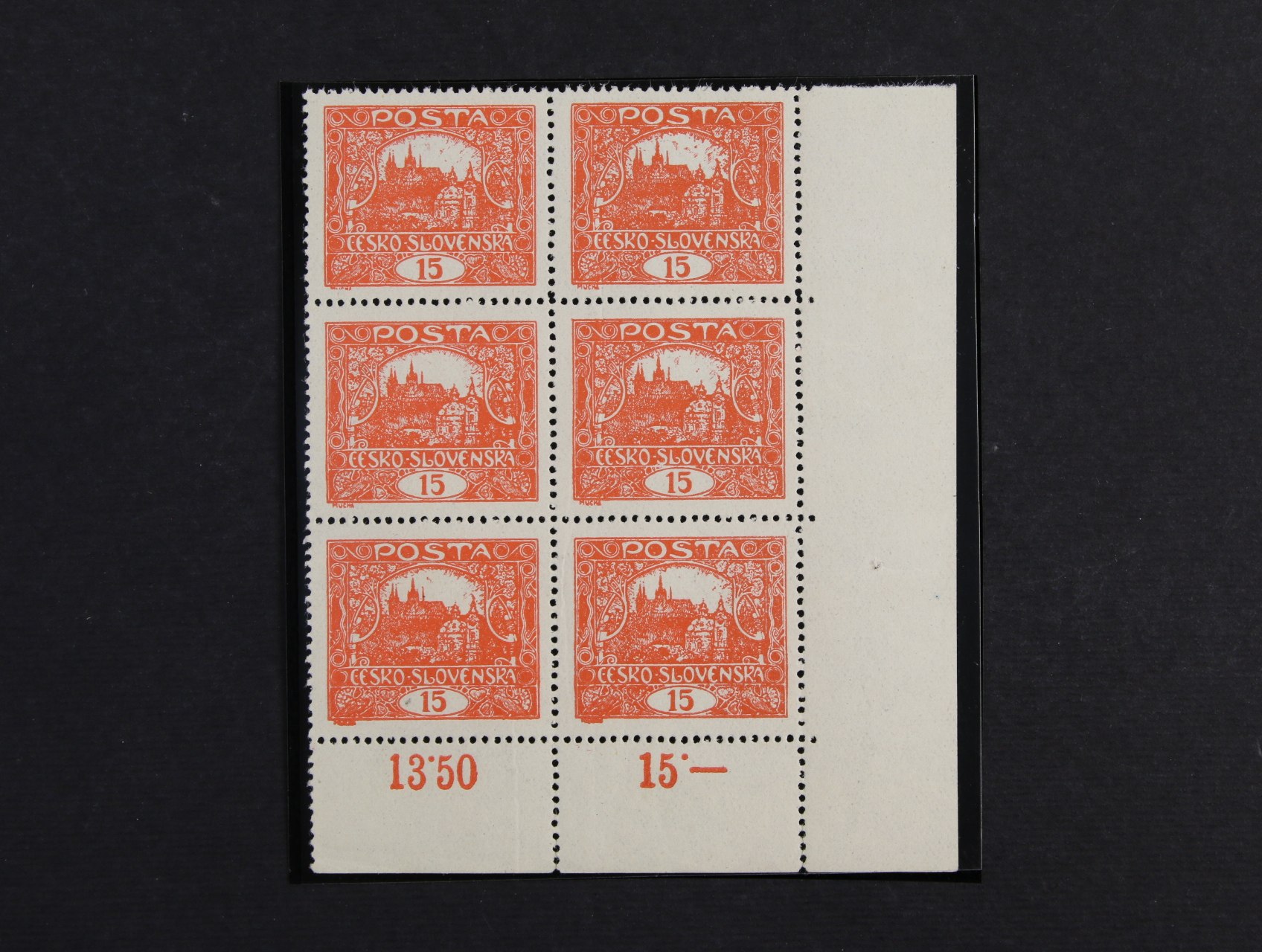 69 zn. č. 6 ve čtyřbloku s téměř kompl. stroj. obtiskem, v horní části nepatrné lomy v papíru a neznatelná stopa po nál., zk. Gilbert 2600
