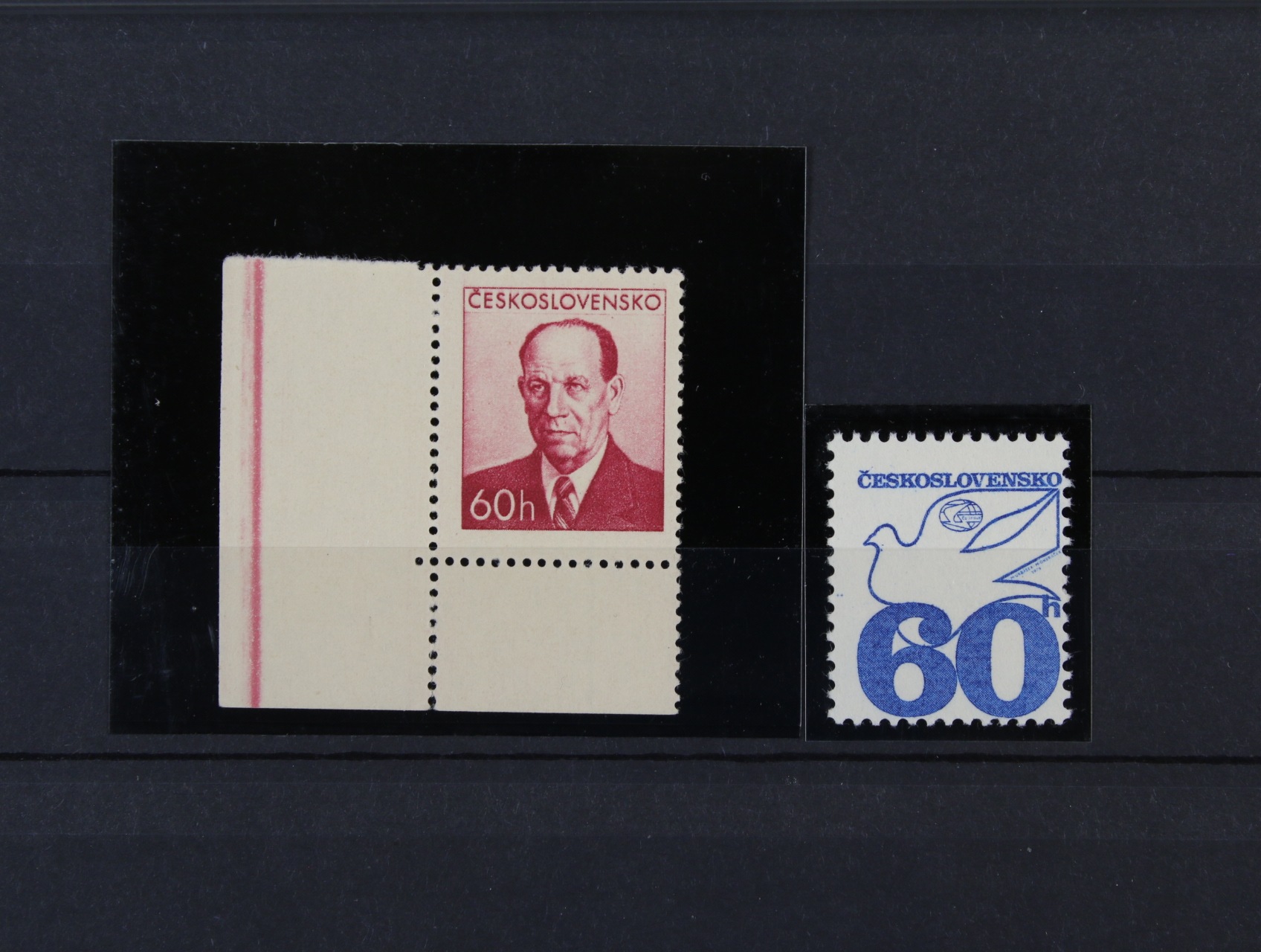 1086 zn. č. 737 - levý spodní roh. kus s TV červená skvrna pod N a obtiskem lišty na levém okraji, zn. č. 2113 VV 1 tisk jen modrou barvou 400