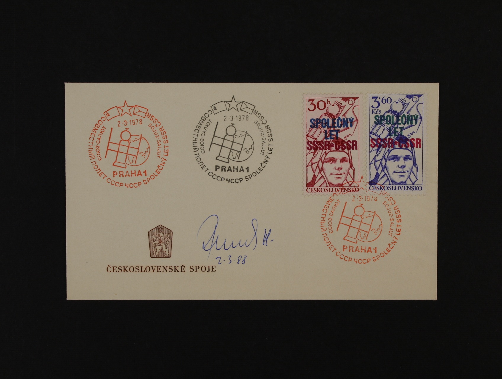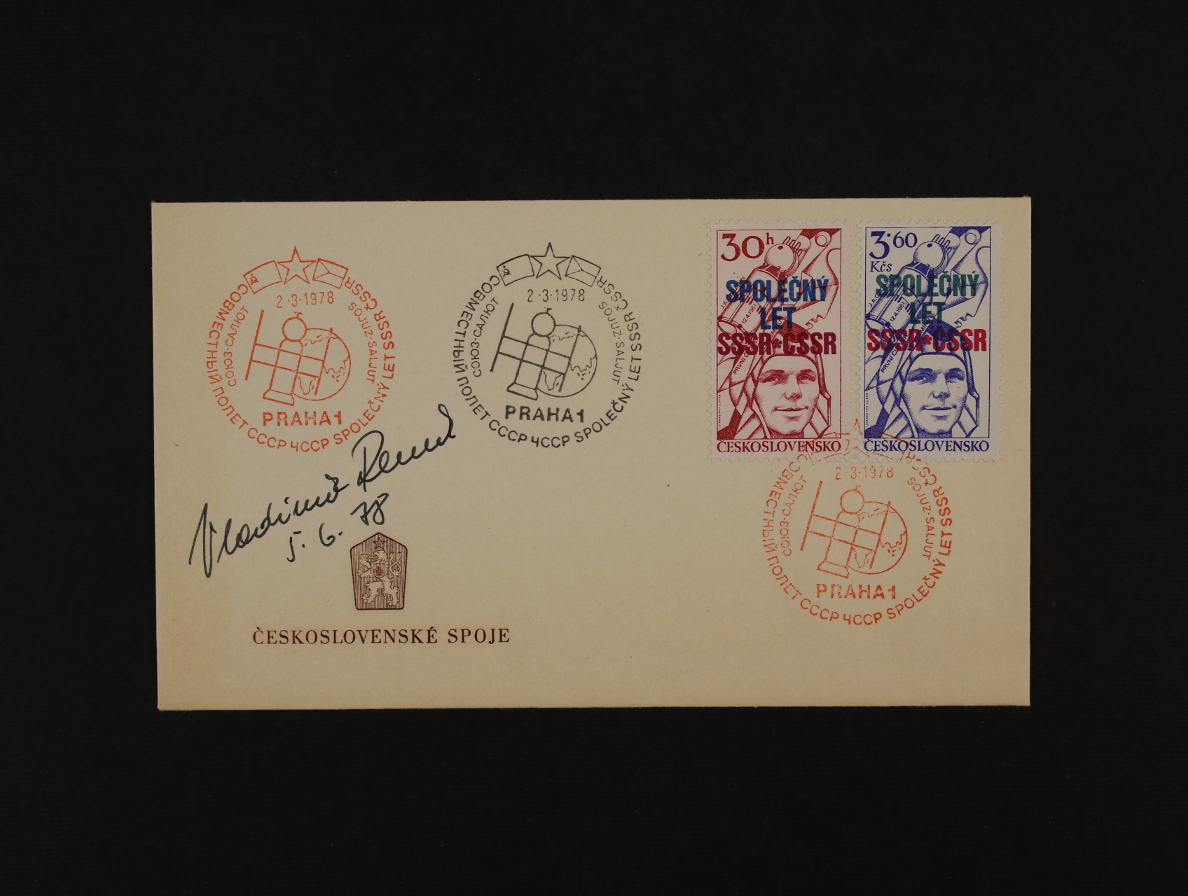 1304 Zvláštní příležitostní obálky FDC - v prodeji P A/78 + B/78 - Společný kosmický let + k tomu + navíc pamětní obálka, vše s podpisy kosmonautů V. Remek a A. Gubarev 300