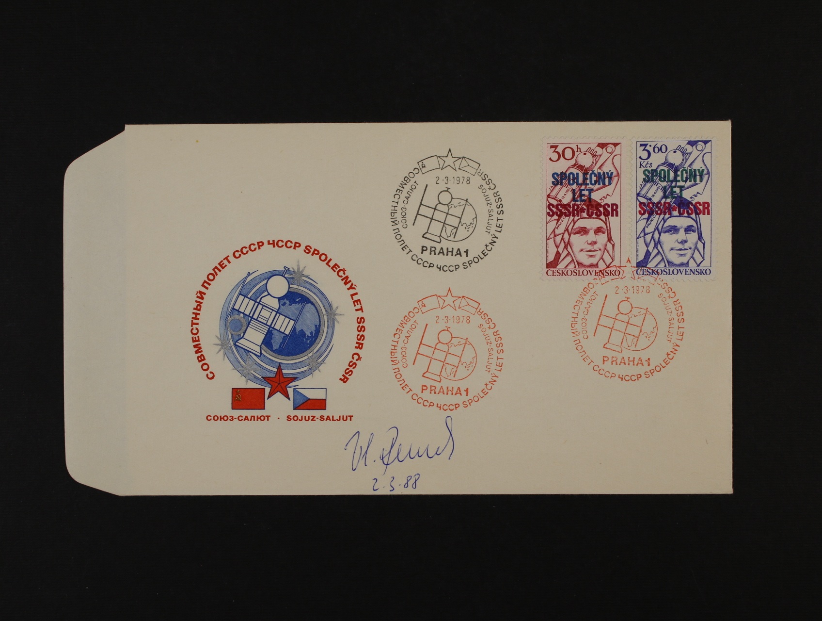 1305 Ministerská FDC M A/78 - Společný let , 165x95mm, s podpisem kosmonauta V. Remek 2.3.88 400
