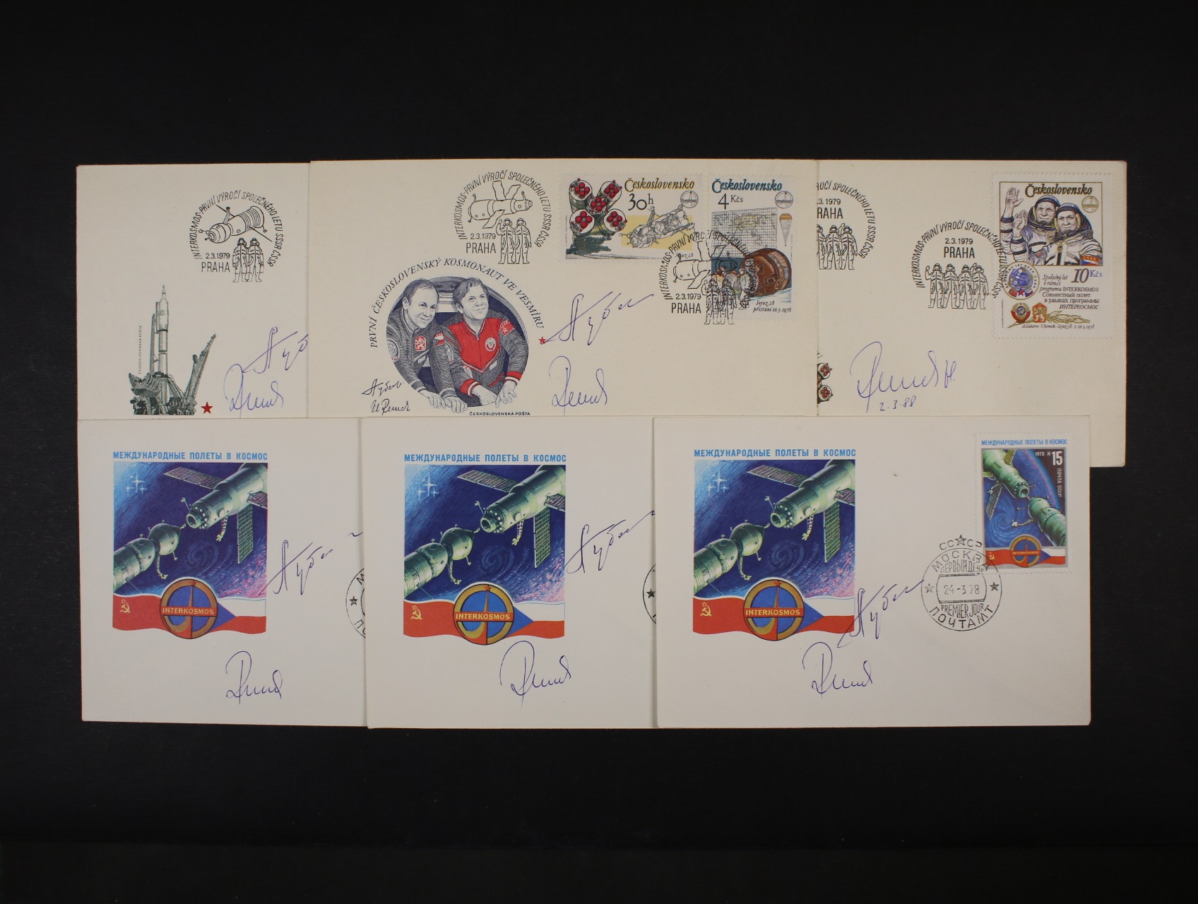 1307 FDC obálky 4A, B, C/79 + obálky SSSR - Interkosmos, vše s podpisy kosmonautů V. Remek a A. Gubarev, celkem 6ks 200