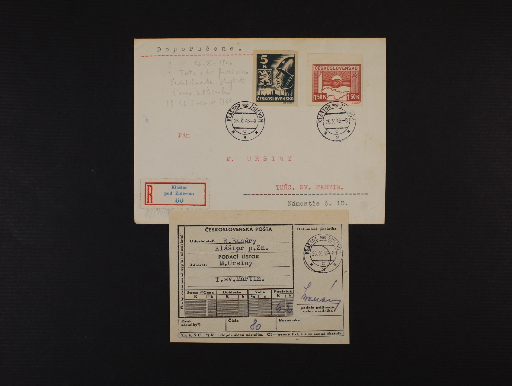 1308 R-dopis do Turč. sv. Martina frank. zn. č. 353 + 355, pod. raz. KLÁŠTOR POD ZNIEVOM 36.10.46, prošlé po platnosti zn. - filatelistický dopis 300