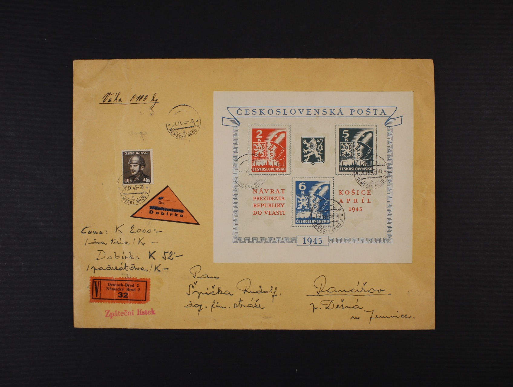 1310 cenné psaní pojištěné na 2000 Kčs s dobírkou 52 Kčs frank. A č. 360 - 62 + zn. 392, pod. raz. NĚMECKÝ BROD 20.9.45 500