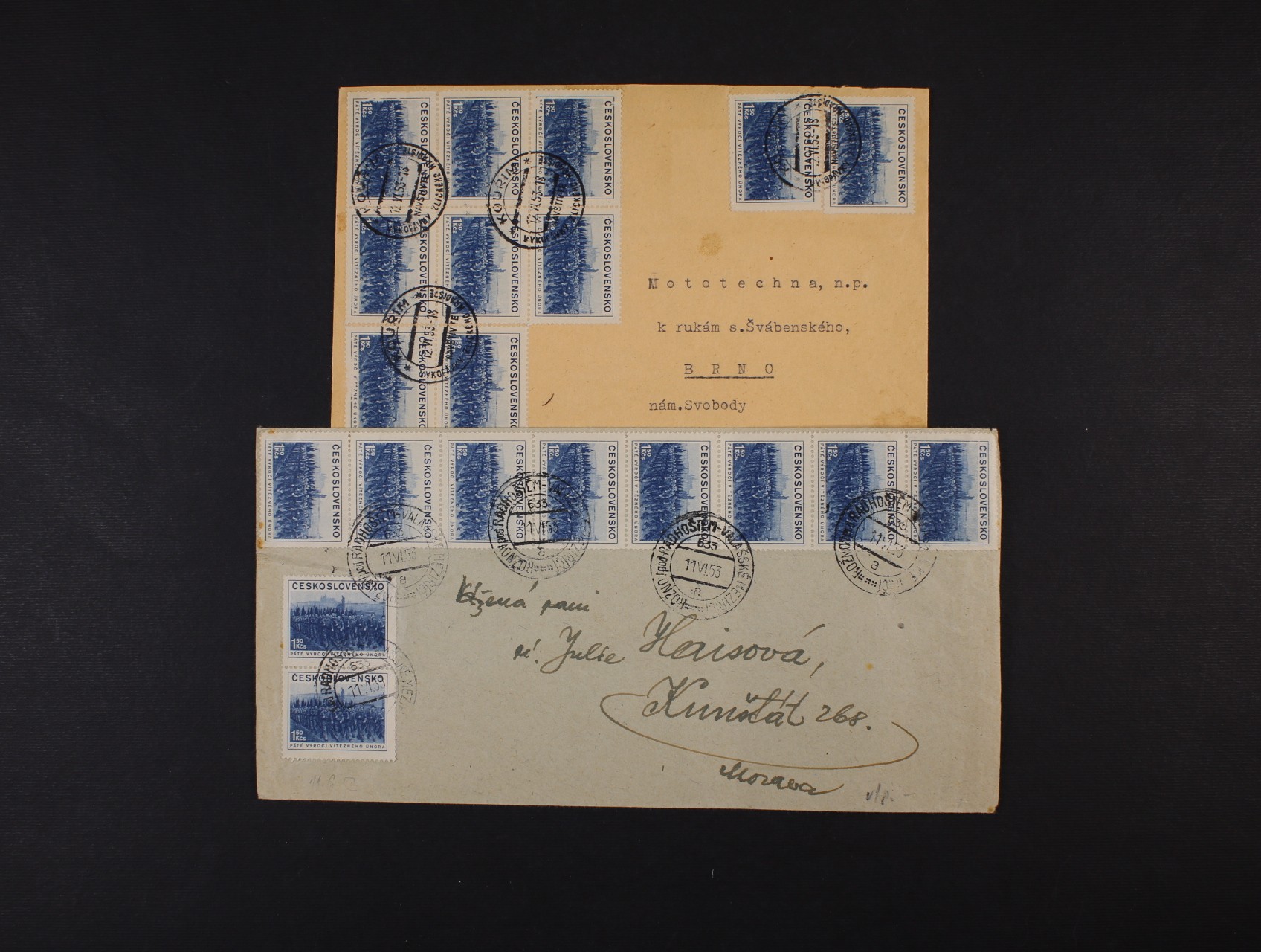 1312 Měnová reforma - dopis do Kunštátu frank. násobnou frankaturou zn. č. 704 (20 ks), přepr. VLP s pod. raz. ROŽNOV POD RADHOŠTĚM - VALAŠSKÉ MEZIŘÍČÍ č. 635 11.6.53 a dopis frank. zn. č. 704 (20x), pod. raz. KOUŘIM 12.6.53, zajímavé 500