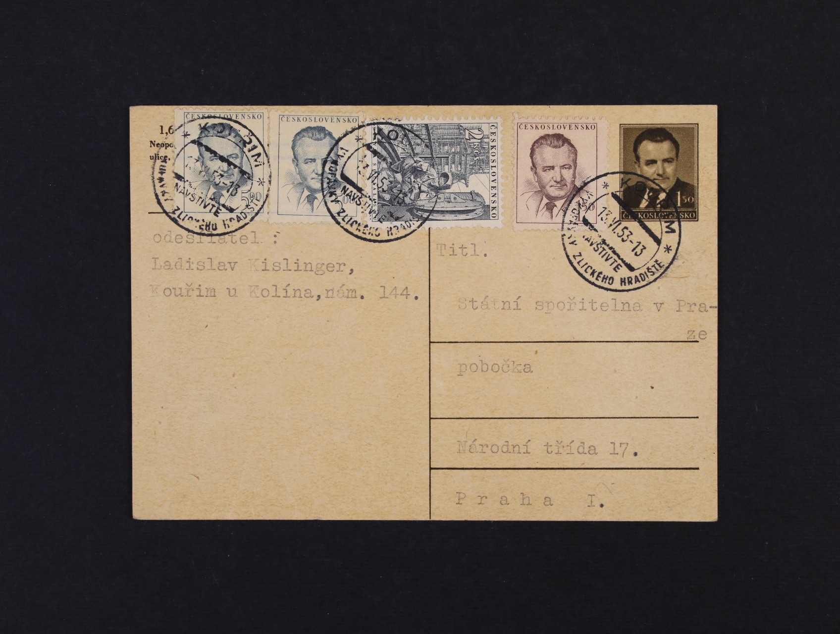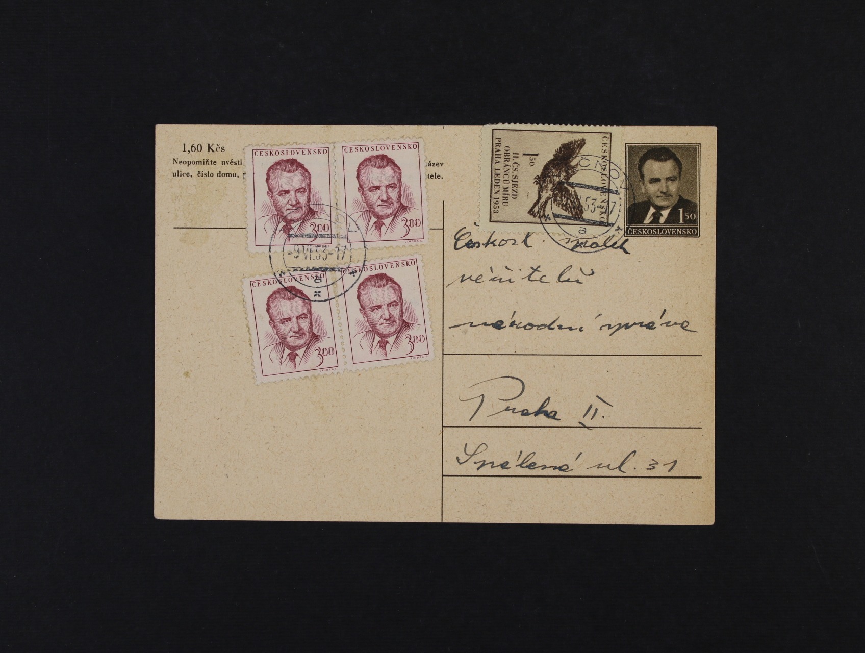 1313 Měnová reforma - KL 1,50K K.G. dofrank. pestrou frankaturou, pod. raz. KOUŘIM 13.6.53, zajímavé 300