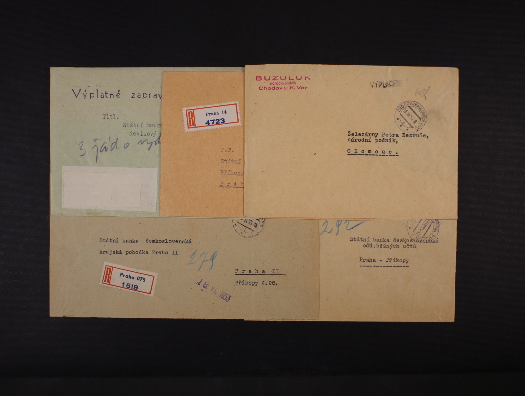 1315 Měnová reforma - sestava 5 ks firemních dopisů (3x RECO) s vybraným výplatným v hotovosti s raz. z různých míst z 10. - 17.6.53, zajímavé 800