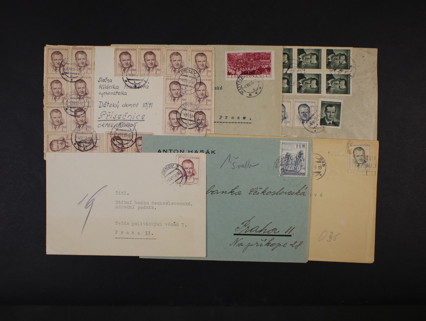 1316 Měnová reforma - sestava 5 ks dopisů a jedné přední strany - zajímavé jednoznámkové, násobné a pestré frankatury s raz. z různých míst s datací 3.6.53- 6.6.53 800