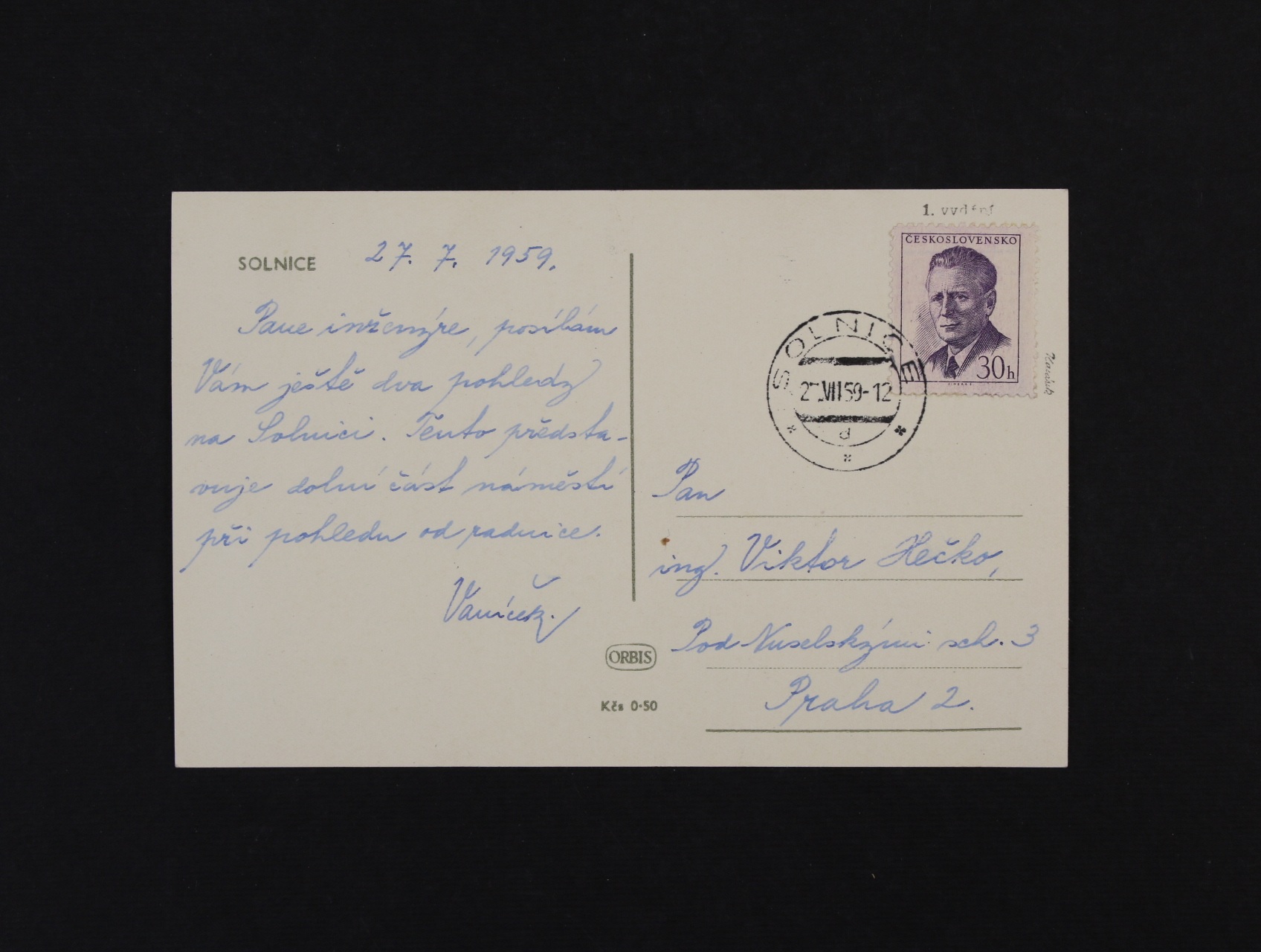 1318 celistvost do Prahy frank. zn. č. 1091 X, I. vydání (chybotisk), pod. raz. SOLNICE 27.7.59, zk. Karásek 700
