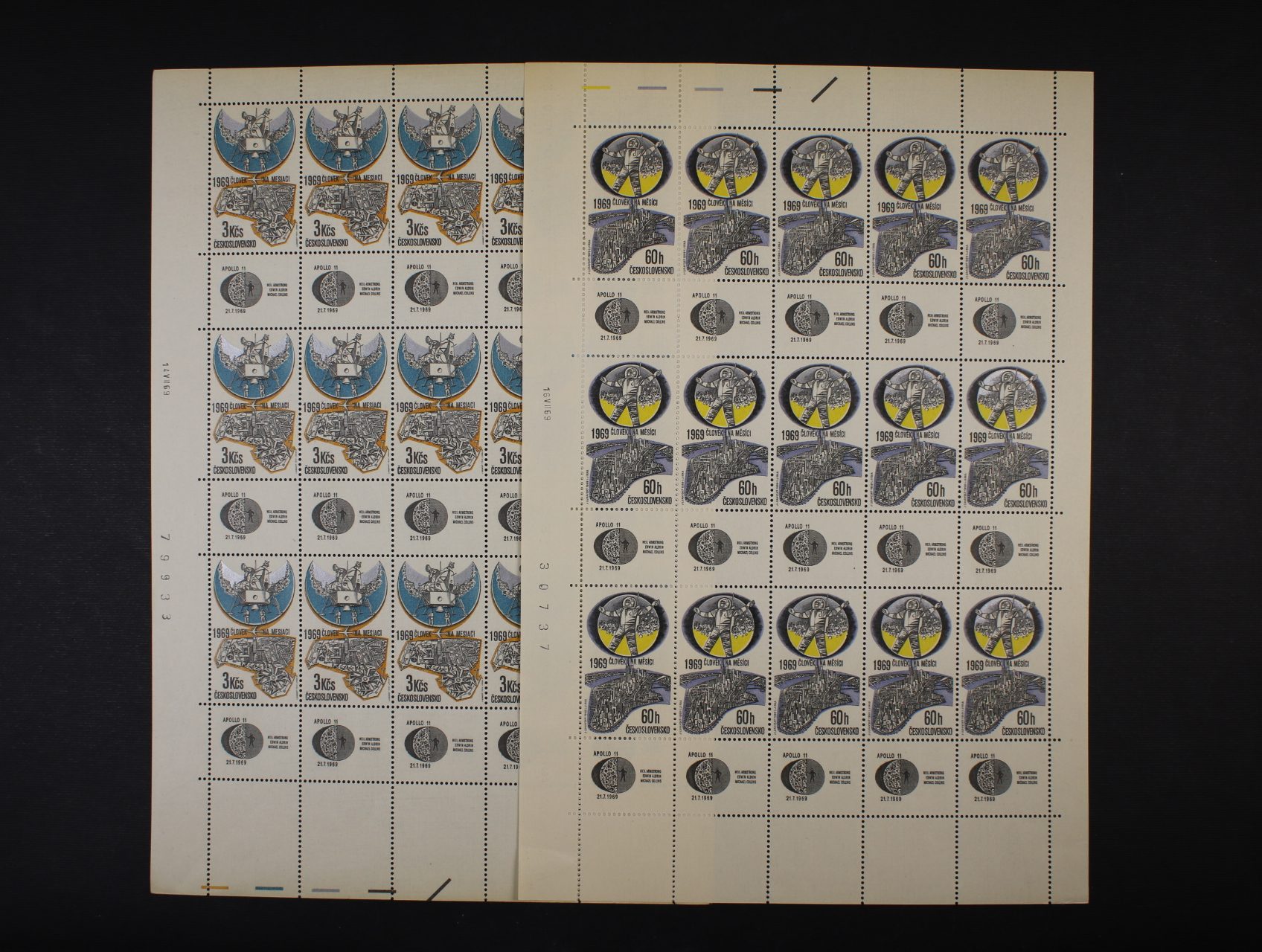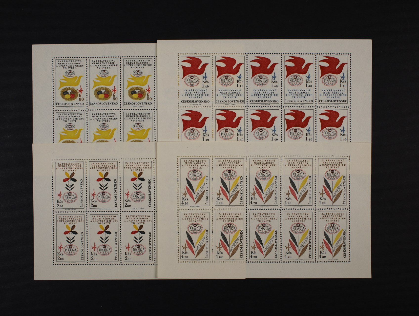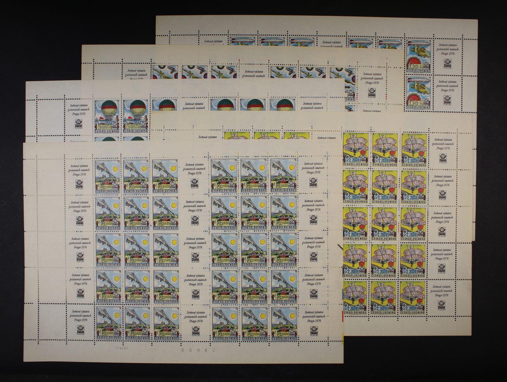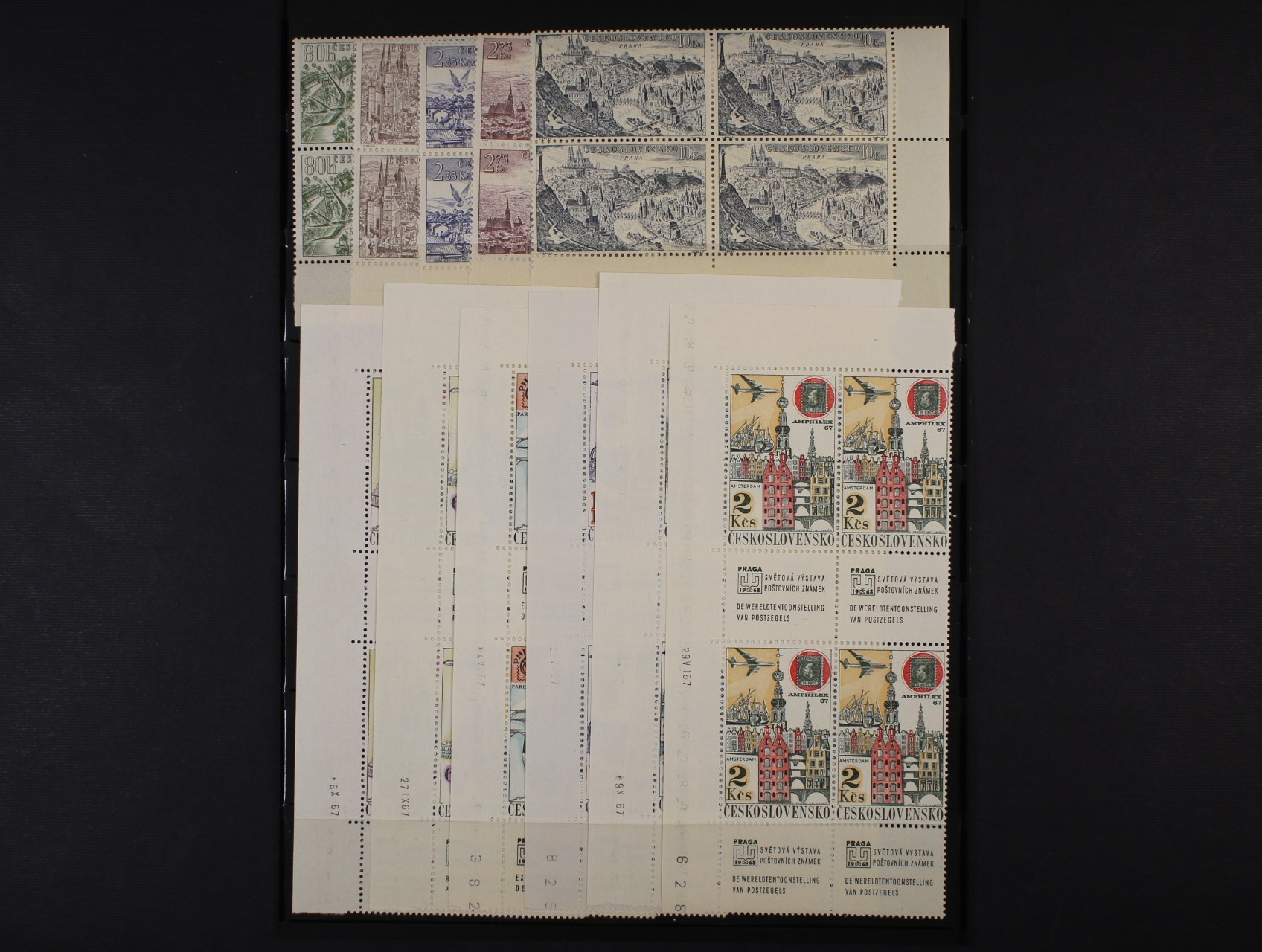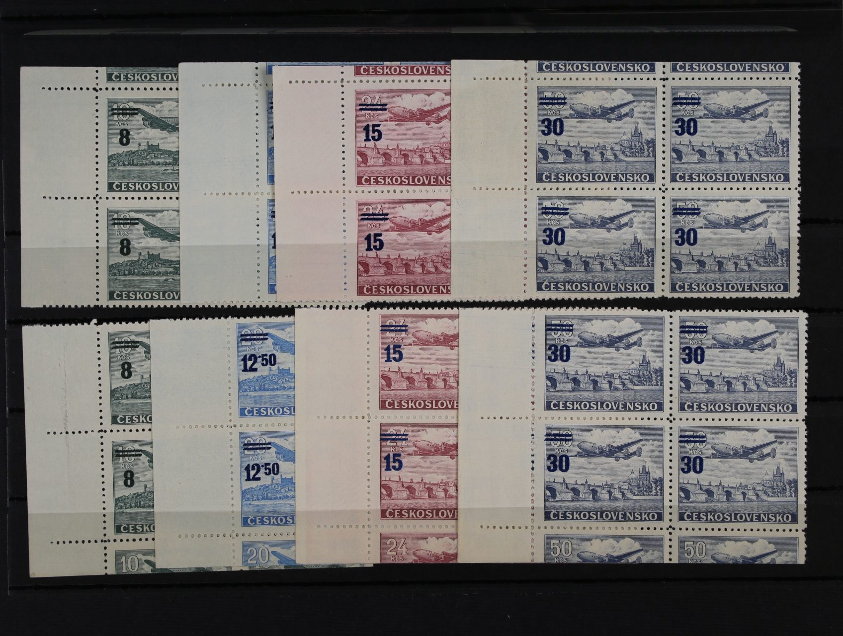 zn. L č. 37 - L 41 - pravé dolní roh. čtyřbloky s daty tisku + L 56 - L 61 (zn. L 59xb) pravé horní roh. čtyřbloky s meziarším a kupony a datem tisku, + PL L 62