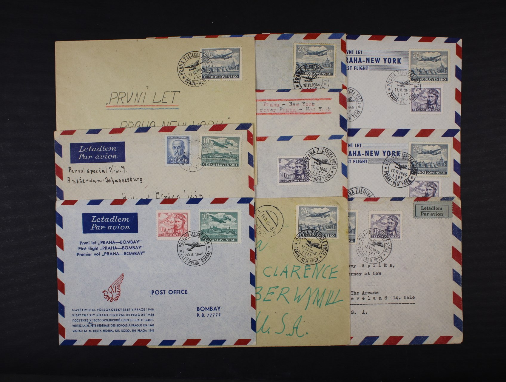 dopis přepr.1. letem Praha - Bombay s pod. raz. PRAHA 7 LETECKÁ POŠTA 10.8.1948, přích. raz., + dopis přepr. 1. letem Amsterdam - Jižní Afrika, pod. raz. PRAHA 7 LETECKÁ POŠTA 22.9.46, fialový let. kašet KLM, přích. raz., + sestava 8 ks celistvostí přepr. 1. letem Praha - New York 17.4.46 (6x RECO) z různých měst (Božkov, Břasy, Litovel, Olomouc, Pardubice, Praha), zajímavé