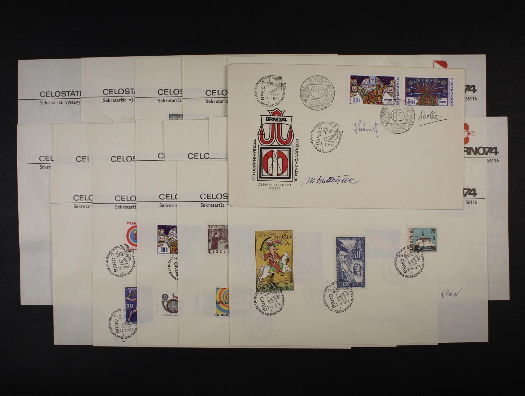 celostátní výstava pošt. zn. BRNO 74 - sestava 17 ks pam. listů s vylepenými zn. a 1 ks FDC s podpisy autorů nebo rytců čs. zn., mj. C. Bouda, A. Brunovský, J. Goldscmidt, J. Herčík, M. Hegar, Frant. Hudeček, B. Housa, M. Jirka, V. Kovařík, J. Liesler