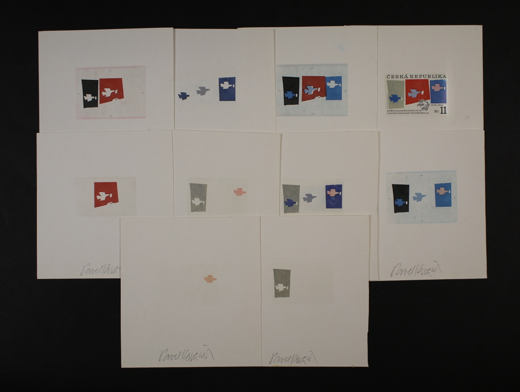 ZT zn. č. 48 v orig. barvě na kousku karton. papíru + 9 tisk. fází na kouscích papíru, vše sign. autorem návrhu Pavel Kovařík, zajímavé