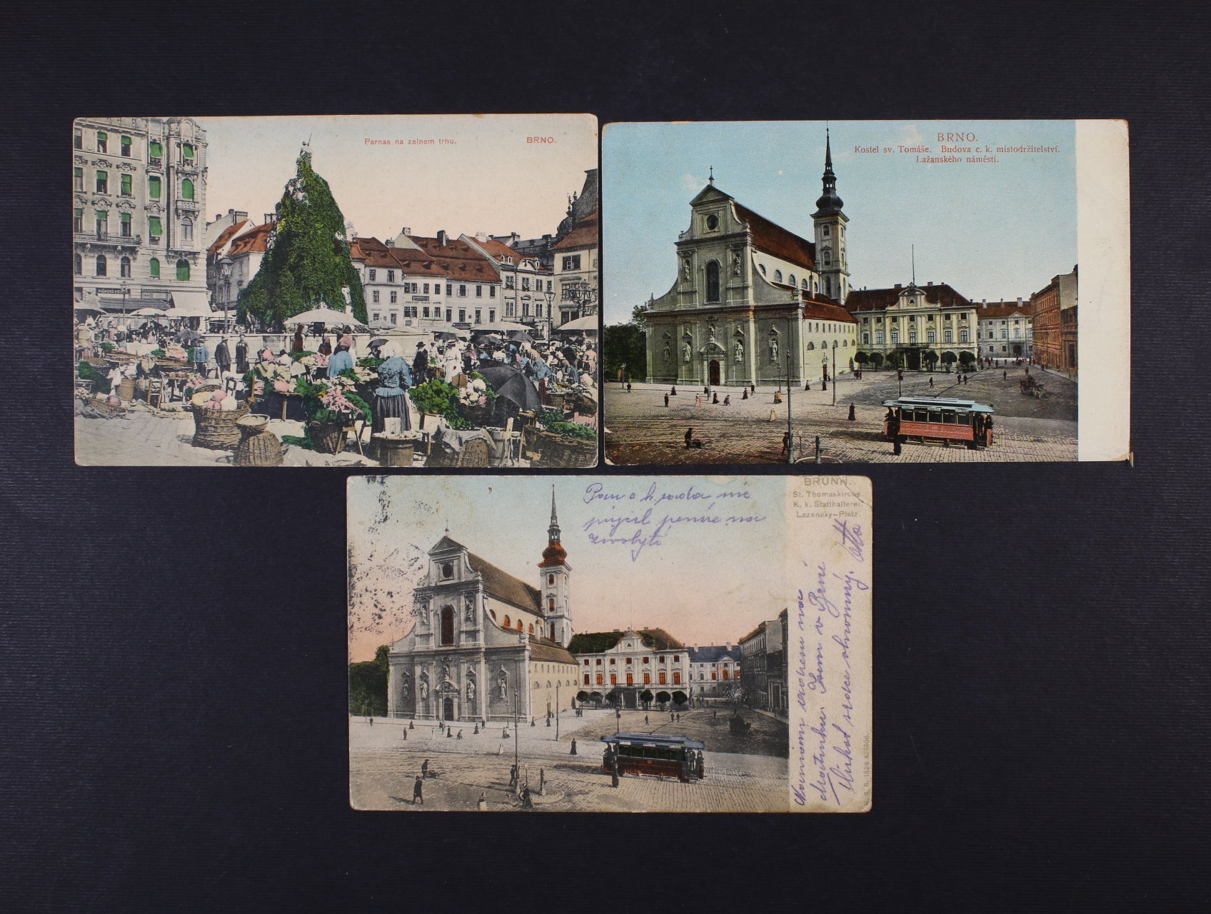 1401 Brno - tři bar. pohlednice - Lažanský Platz, použitá 1906, Brno - Parna na Zelném trhu, nepoužitá, kostel sv. Tomáše, nepoužitá 500