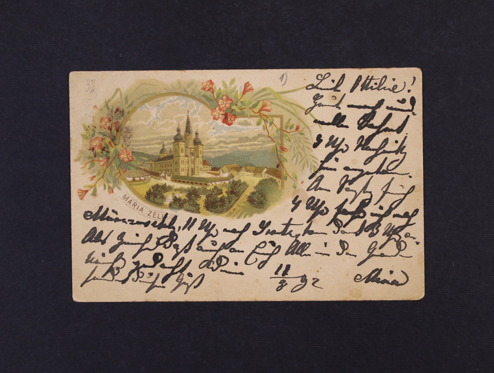 1420 Maria Zell - bar. litograf. koláž, použitá 1892, odlepená zn. 400