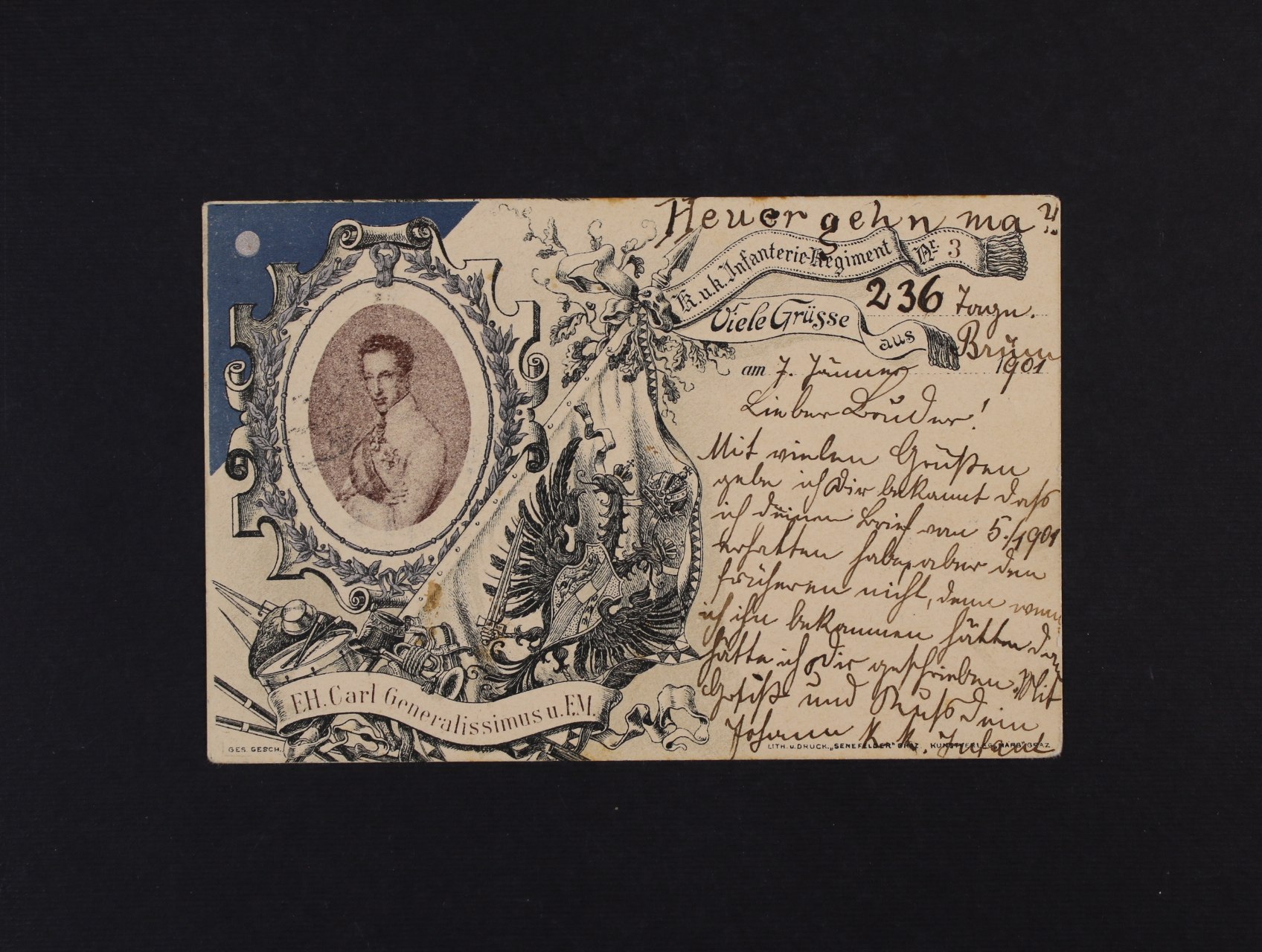 1441 Vojenské - bar. pohlednice K.u.K. Infanterie Regiment Nr. 3, použitá 1901, zajímavé 200