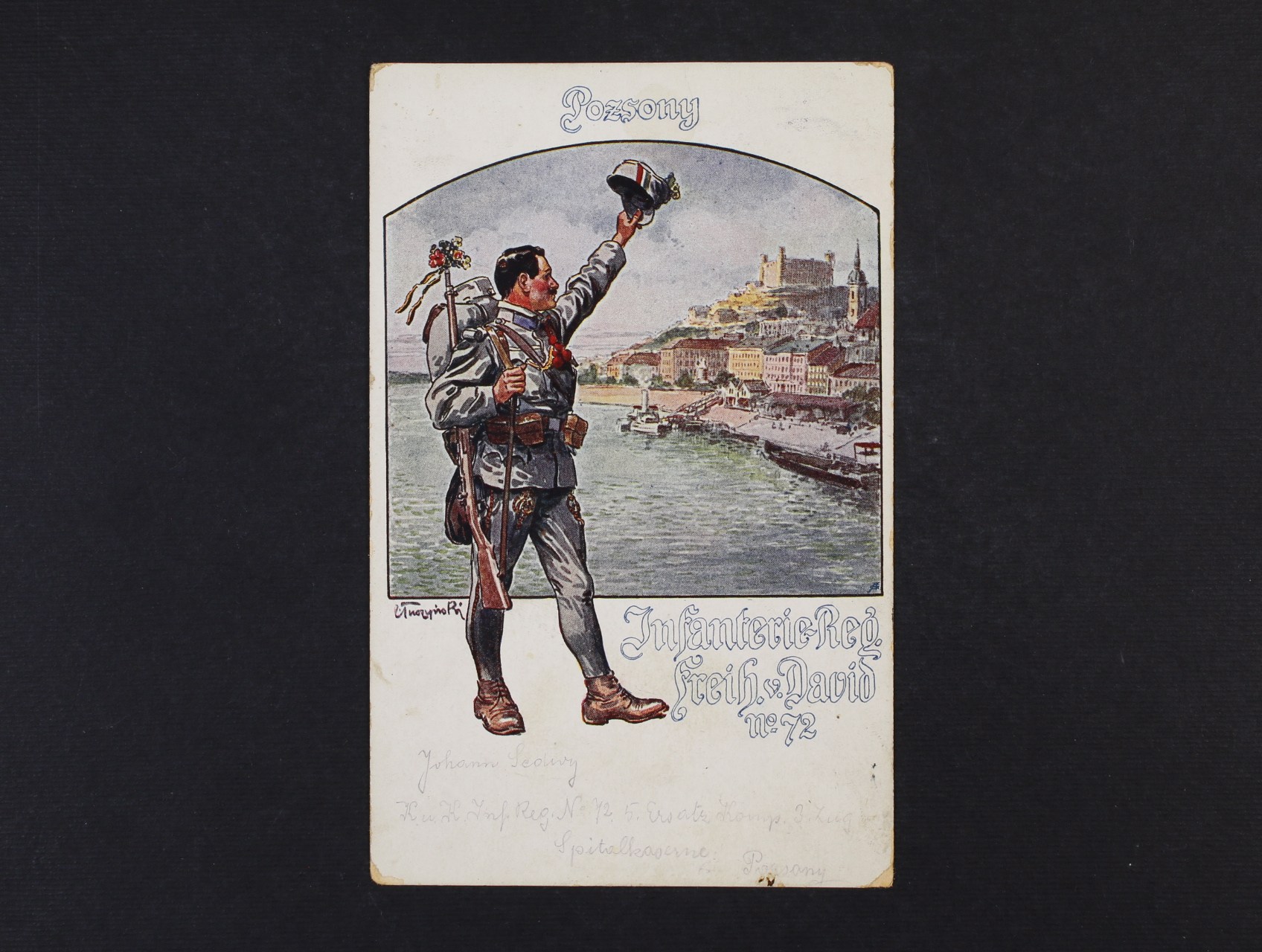 1442 Vojenské - bar. pohlednice s motivem K.u.K. Infanterie Regiment Nr. 72 Bratislava, použitá 200