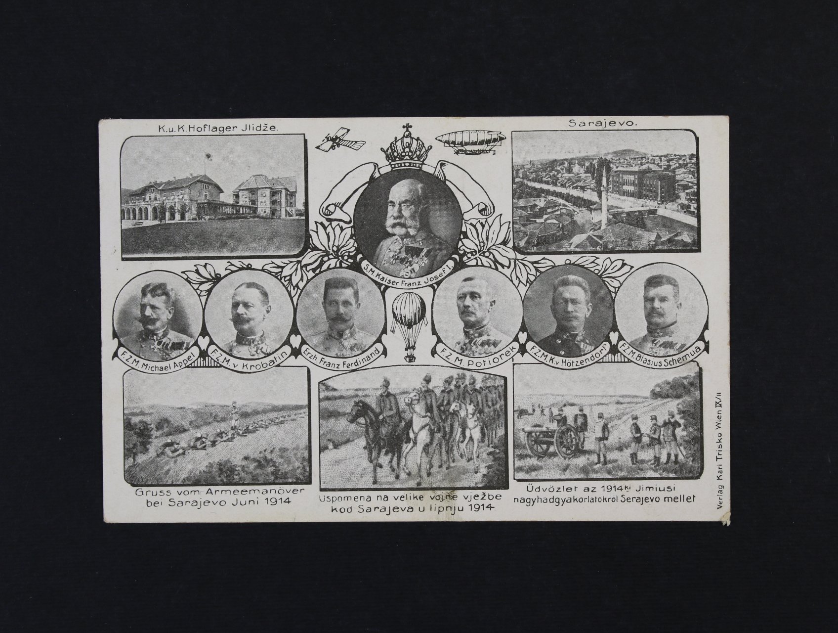 1446 Vojenské - černobílá oficielní pohlednice z armádních manévrů u Sarajeva 1914, použitá 200