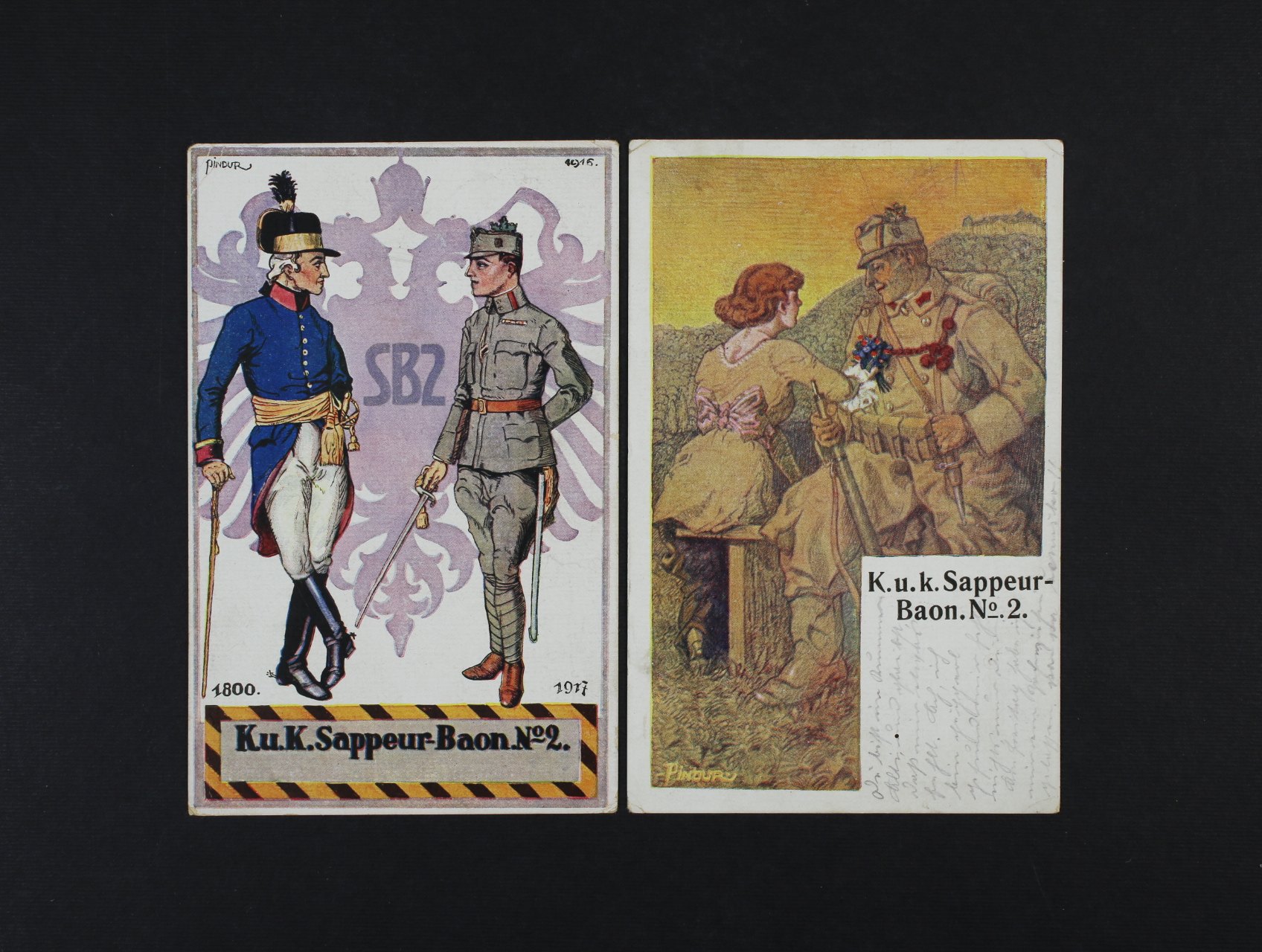 1447 Vojenské - dvě bar. pohlednice s motivem K.u.K. Sappeur- Baon Nr. 2 (C.a K Ženijního praporu č. 2), použité i nepoužité 200