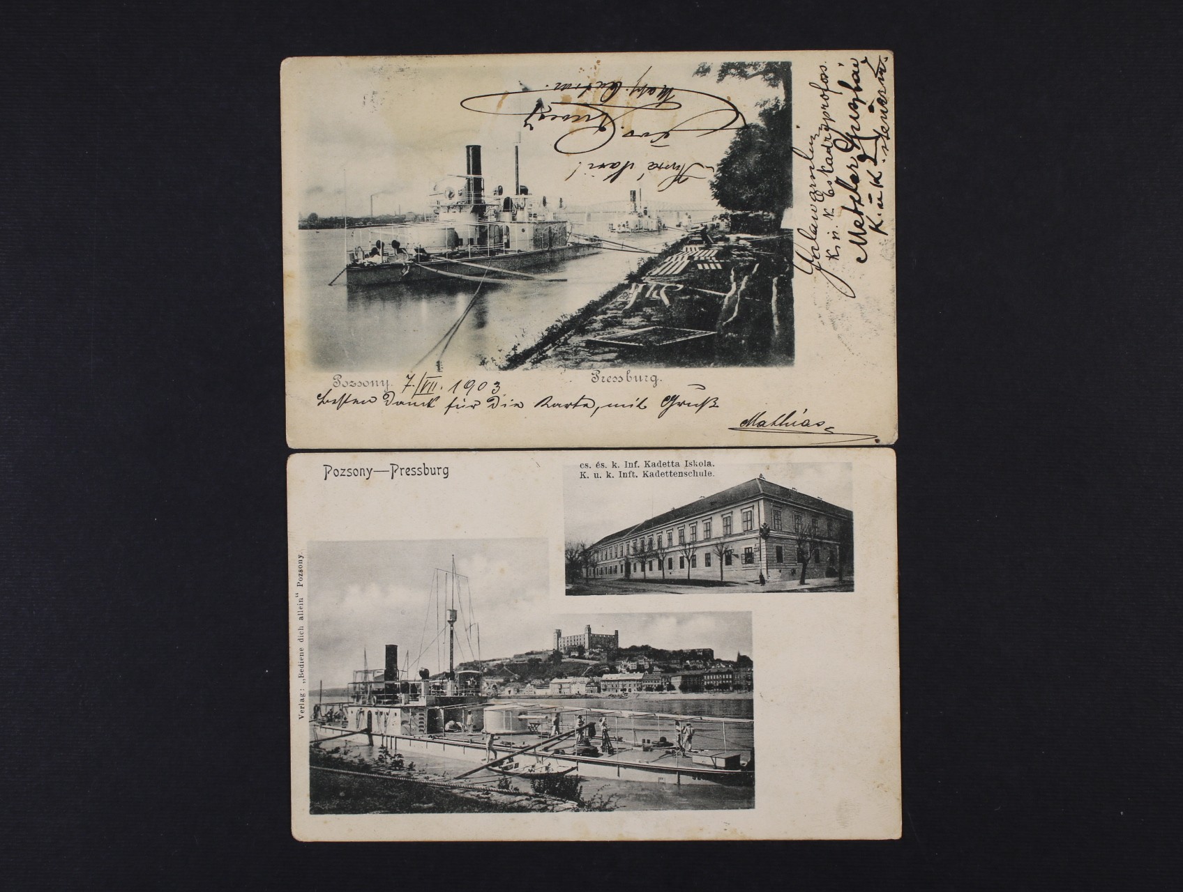 1448 Vojenské - dvě jednobar. pohlednice zachycující lodě podunajské flotily SZAMOS a KÖLÖS, použitá a nepoužitá, zajímavé 400