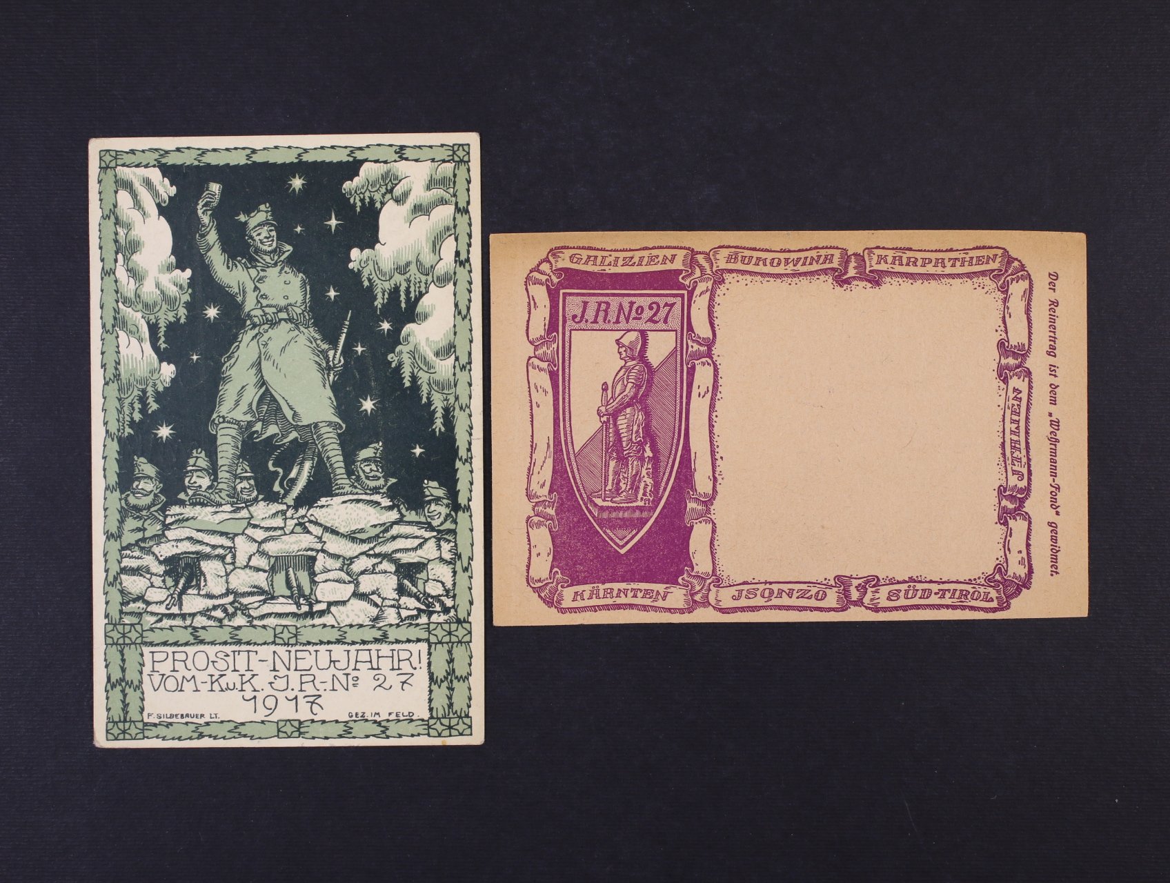 1451 Vojenské - dvě různé pohlednice K.u.K. Infanterie Regiment Nr. 27, použitá a nepoužitá 200