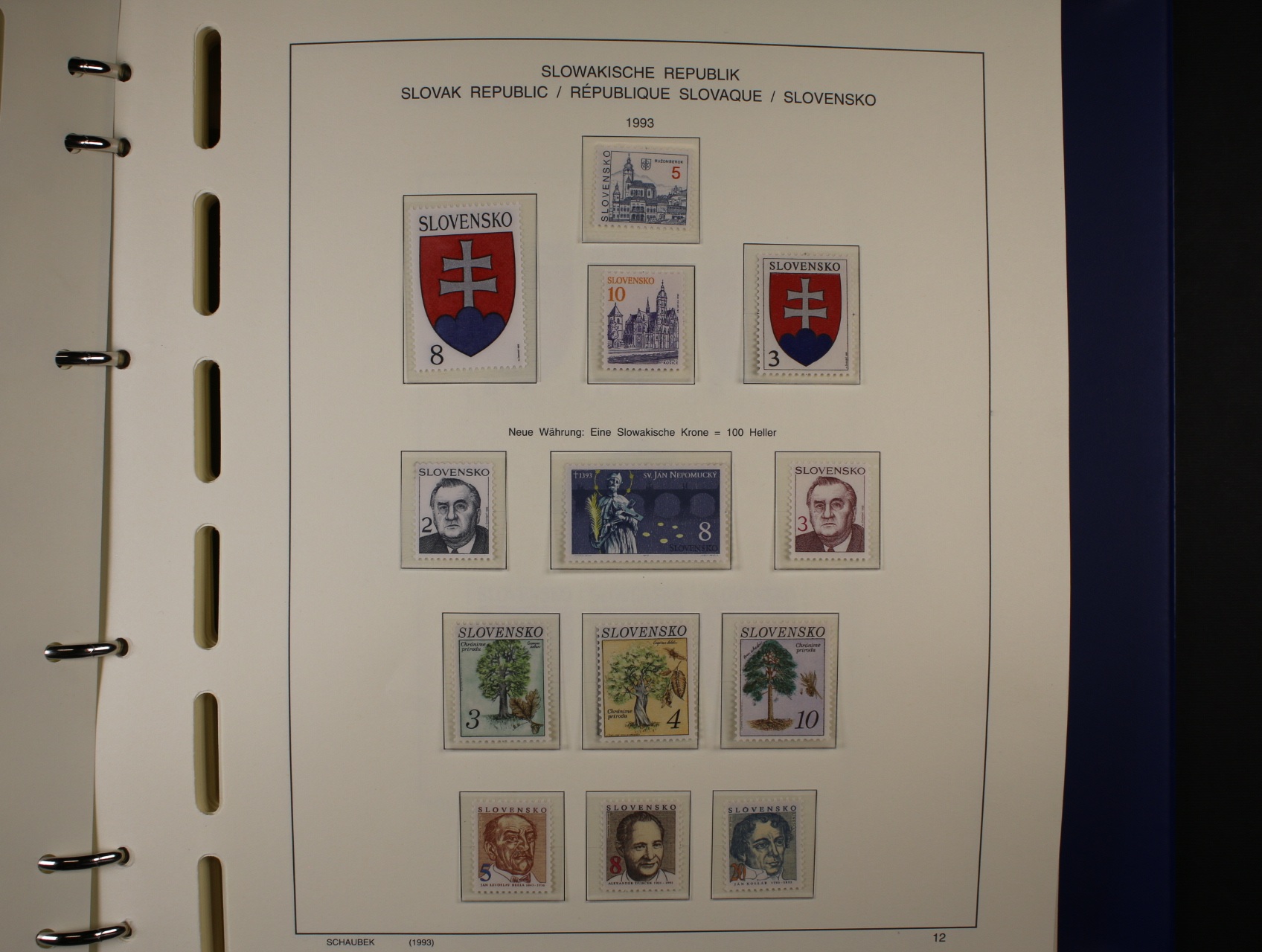 Slovenská republika - téměř kompl. sbírka zn., aršíků, PL, kuponů, soutisků z let 1993 - 2000, uloženo na zasklených listech Schaubek v modrém kroužkovém zásobníku v kazetě a od r. 2001 - 2004 přiložené zn. na destičkách formátu A5, kat. cena cca 800 EUR