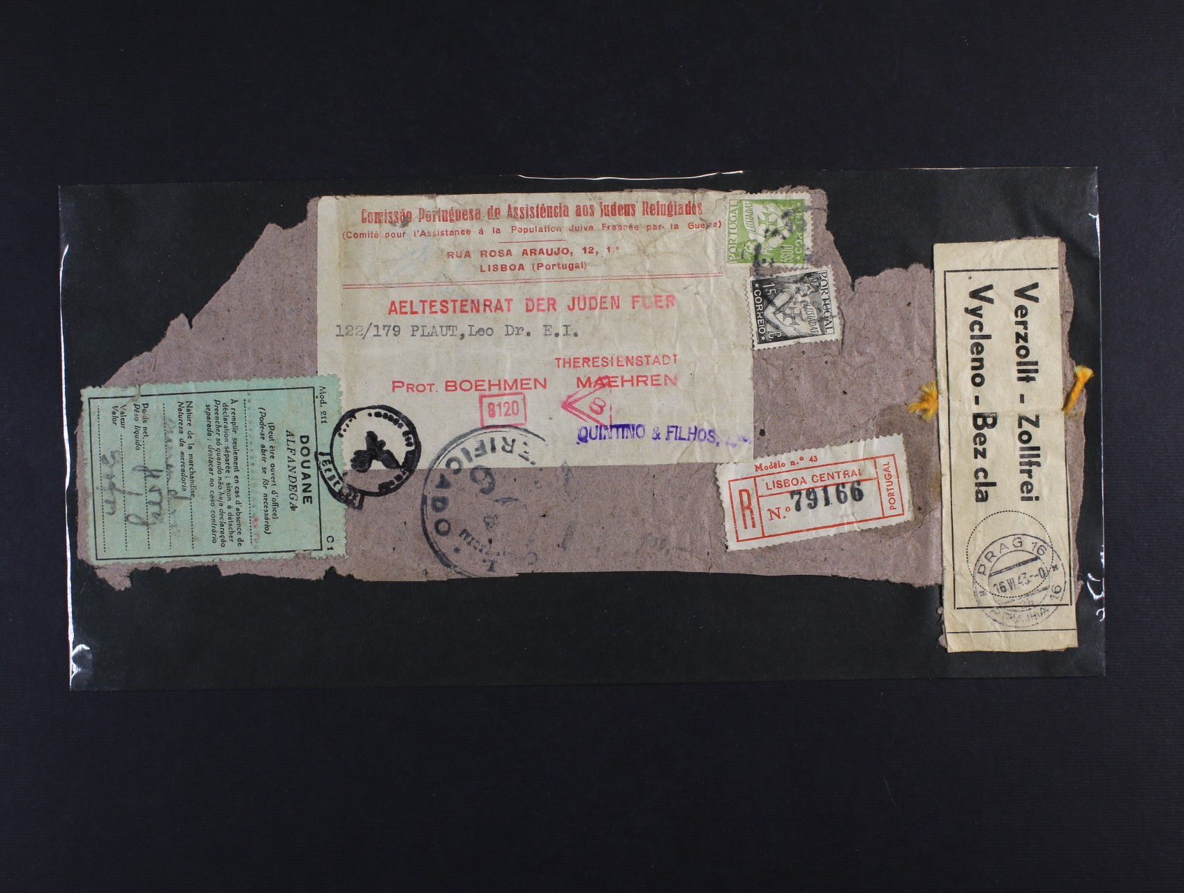 Theresienstadt - velký výstřižek z R-dopisu zaslaného z Portugalska z Lisabonu do KT Terezín, nalepené celní nálepky, razítka, mj. PRAG 16 16.6.43, zajímavé