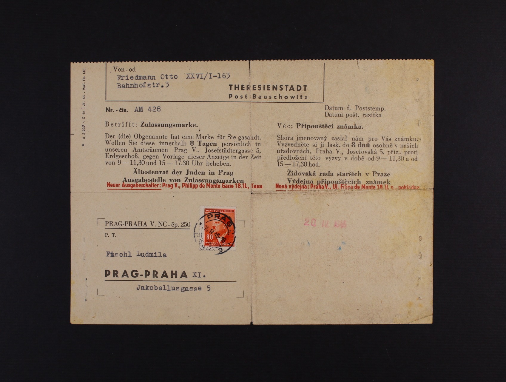 Theresienstadt - připouštěcí formulář s dodatečným červeným dvojjazyčným přítiskem Nová výdejna: Praha V., Ul. Filipa de Monte 18/II. p. pokladna, zaslaný do Prahy, frank. protektor. zn. 80h A.H., pod. raz. 16.4.45, zajímavé, vzácné