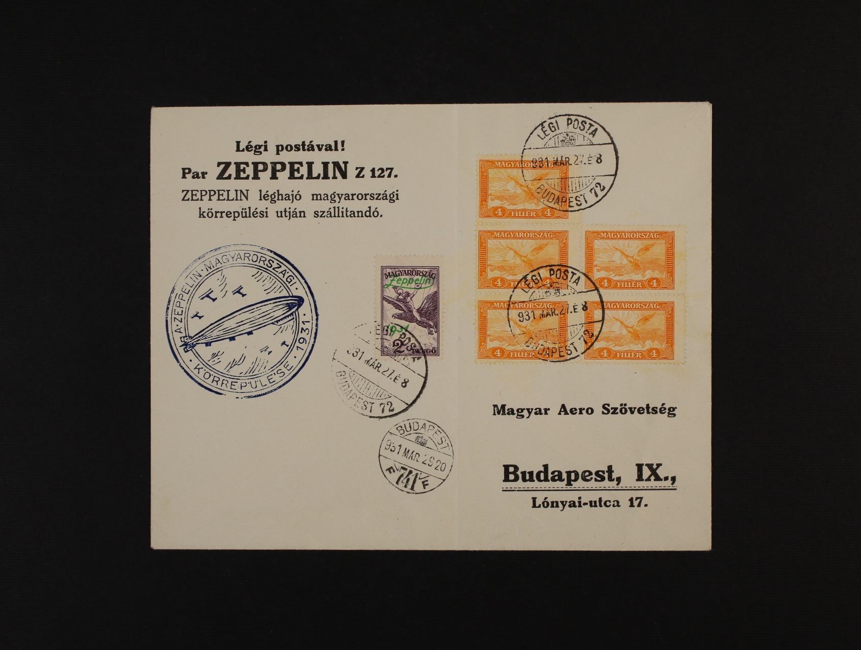 Maďarsko - dopis přepr. zeppelin. poštou Z 127, pod. raz. LÉGI POSTA 27.MAR.31, modrý kašet A. ZEPPELIN. MAGYARORSZÁGI.KÖRREPÜLESE 1931 + přích. raz. BUDAPEST 29.MAR.1931