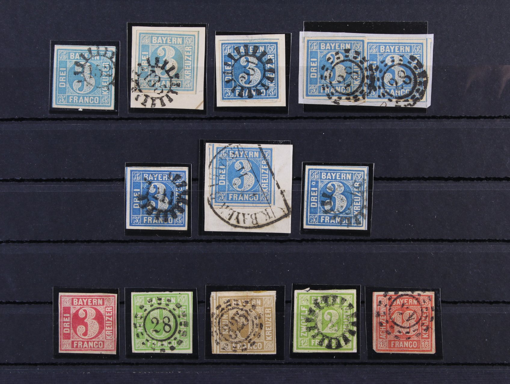 1646 Bavorsko - zn. Mi. č. 2 II (3x zn. + 4x na výstřižku), zn. Mi. č. 5, 9, 11, 12, 13 (lehce zeslabený papír - nepočítáno), znehodnoc. převážně čís. razítky, zajímavé 1000